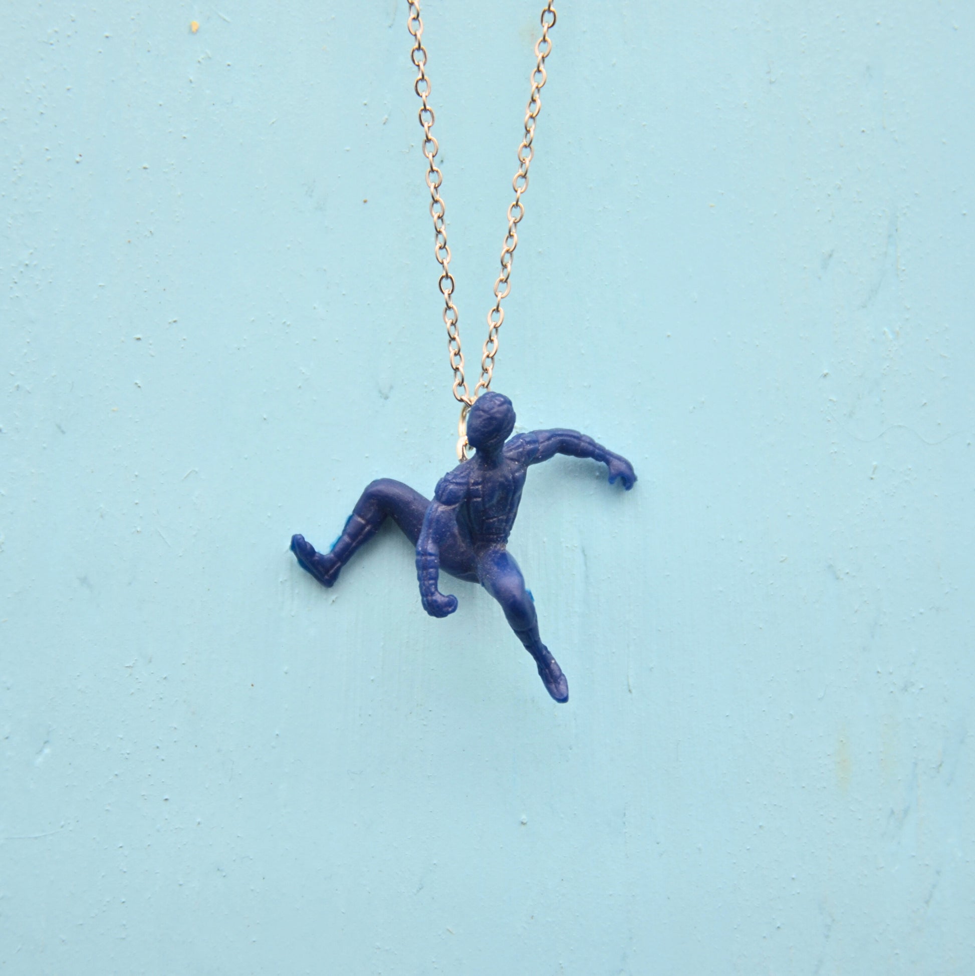 Detta halsband har en blå figur, omsorgsfullt återvunnen från en klassisk leksak och nu ett kreativt och hållbart halsband. Den 45 cm långa kedjan är tillverkad av rostfritt stål, vilket ger en bra hållbarhet och är nickelfritt.