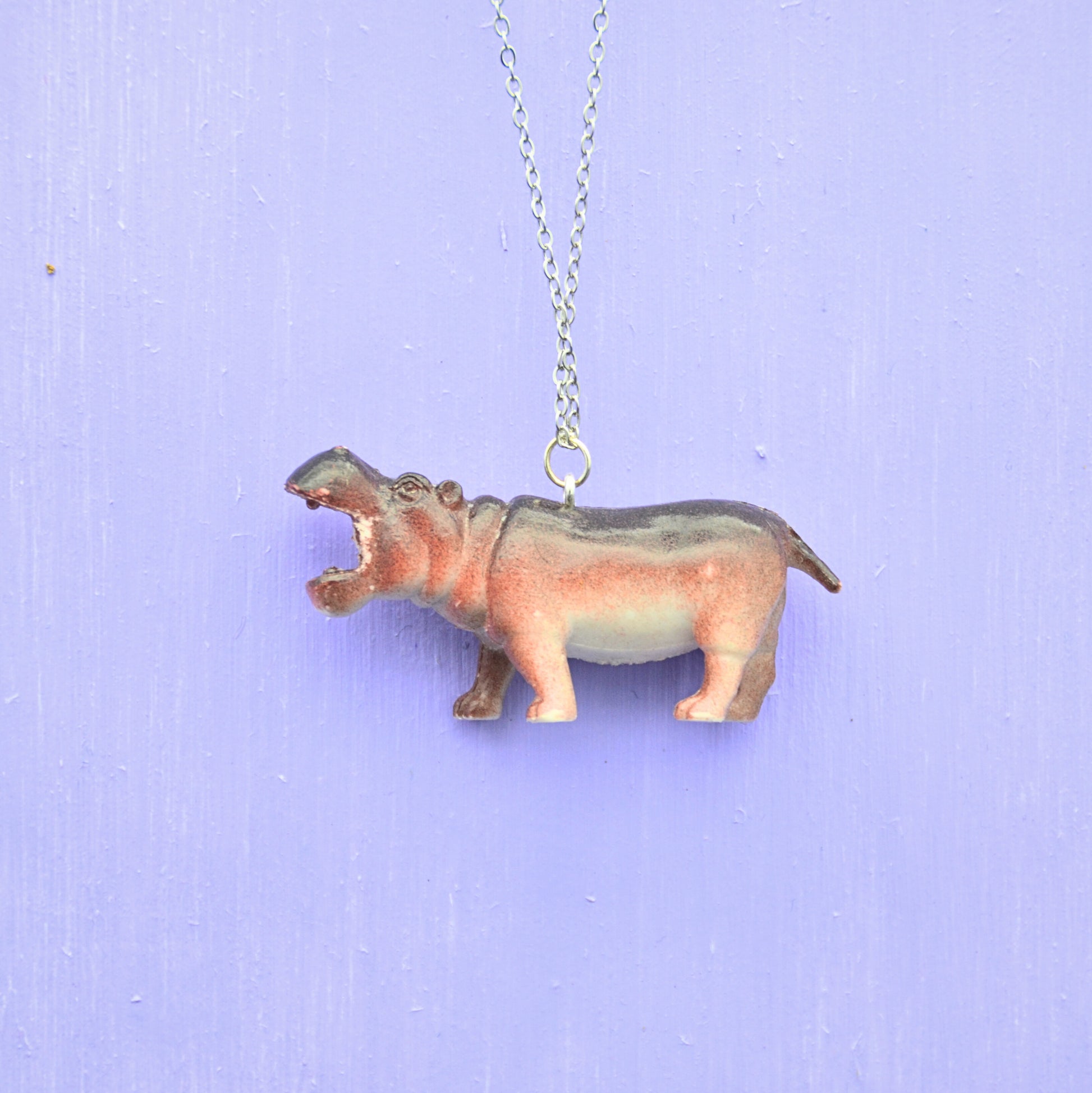 Detta halsband har en flodhäst, omsorgsfullt återvunnen från en klassisk leksak och nu ett kreativt och hållbart halsband. Den 45 cm långa kedjan är tillverkad av rostfritt stål, vilket ger en bra hållbarhet och är nickelfritt.