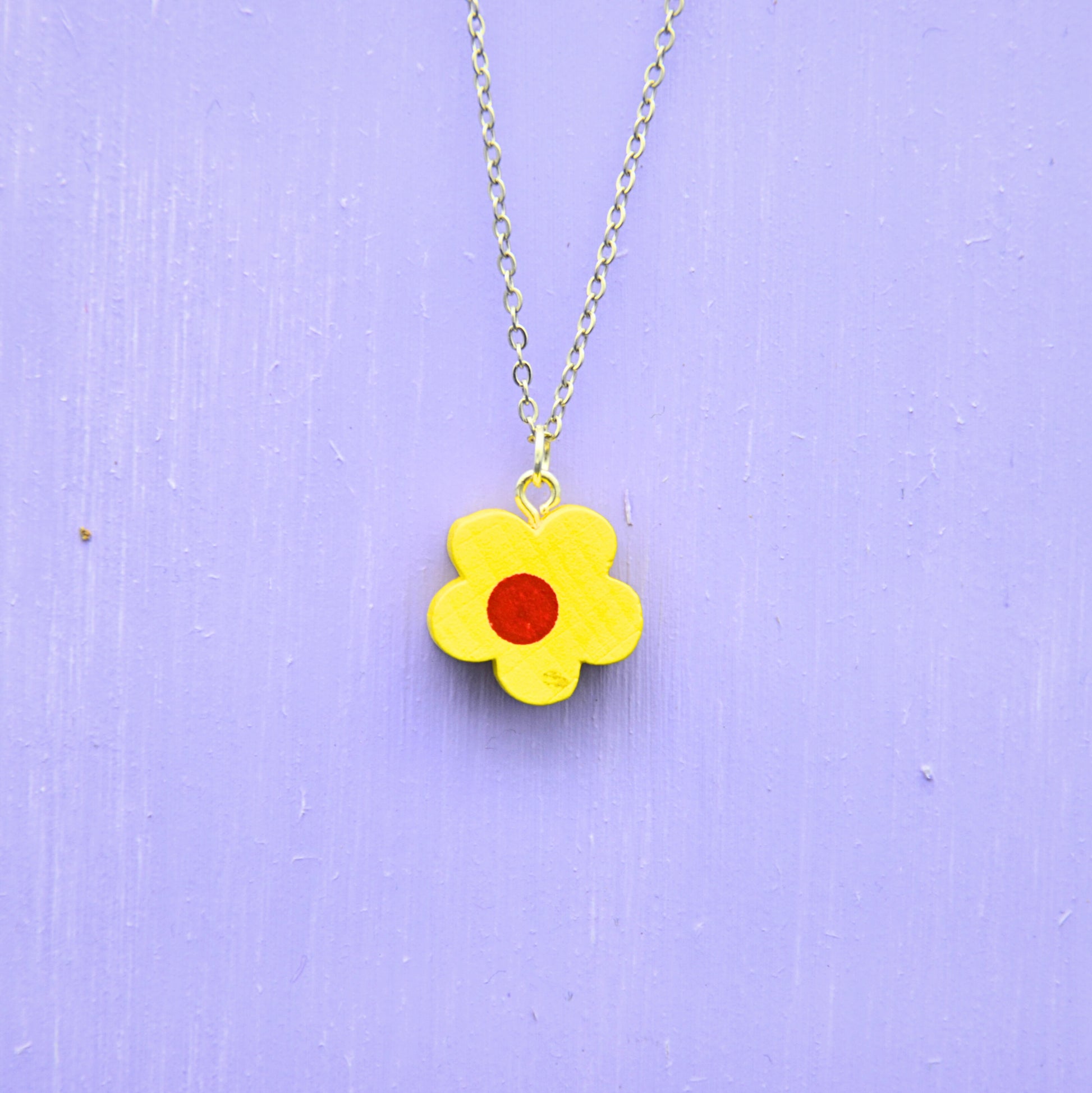 Detta halsband har en liten gul träblomma, omsorgsfullt återvunnen från en klassisk leksak och nu ett kreativt och hållbart halsband. Den 45 cm långa kedjan är tillverkad av rostfritt stål, vilket ger en bra hållbarhet och är nickelfritt.