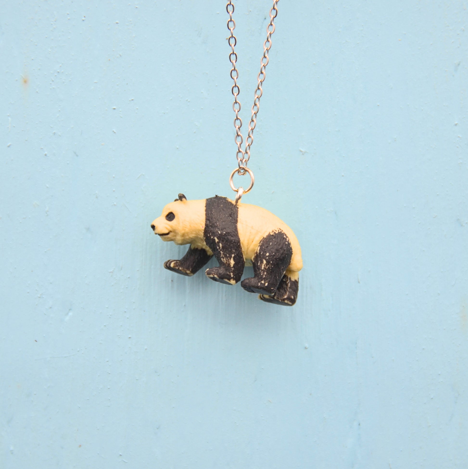 Detta halsband har en panda, omsorgsfullt återvunnen från en klassisk leksak och nu ett kreativt och hållbart halsband. Den 45 cm långa kedjan är tillverkad av rostfritt stål, vilket ger en bra hållbarhet och är nickelfritt.