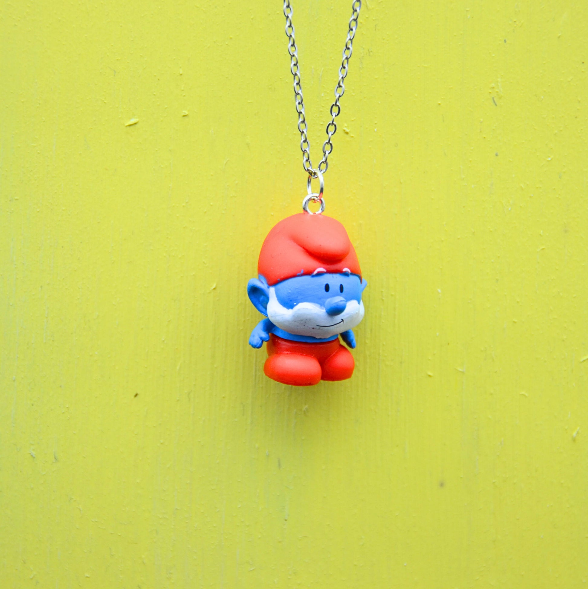 Detta halsband har en minismurf, omsorgsfullt återvunnen från en klassisk leksak och nu ett kreativt och hållbart halsband. Den 45 cm långa kedjan är tillverkad av rostfritt stål, vilket ger en bra hållbarhet och är nickelfritt.