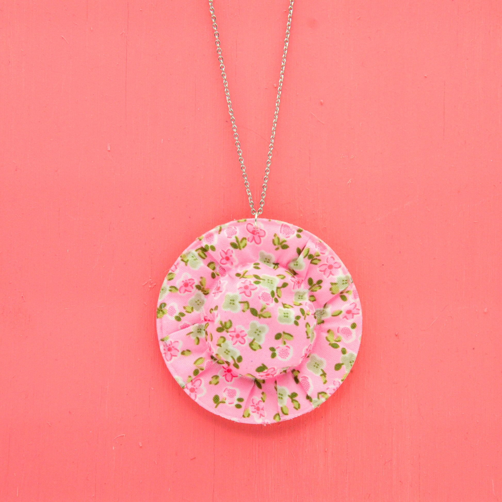 Detta halsband har en blommig hatt i tyg, omsorgsfullt återvunnen från en klassisk leksak och nu ett kreativt och hållbart halsband. Den 45 cm långa kedjan är tillverkad av rostfritt stål, vilket ger en bra hållbarhet och är nickelfritt.
