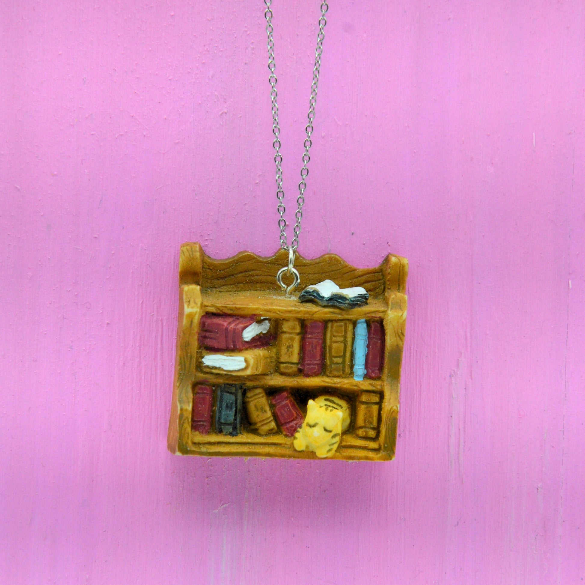 Detta halsband har en liten bokhylla i keramik, omsorgsfullt återvunnen från en klassisk leksak och nu ett kreativt och hållbart halsband. Den 45 cm långa kedjan är tillverkad av rostfritt stål, vilket ger en bra hållbarhet och är nickelfritt.