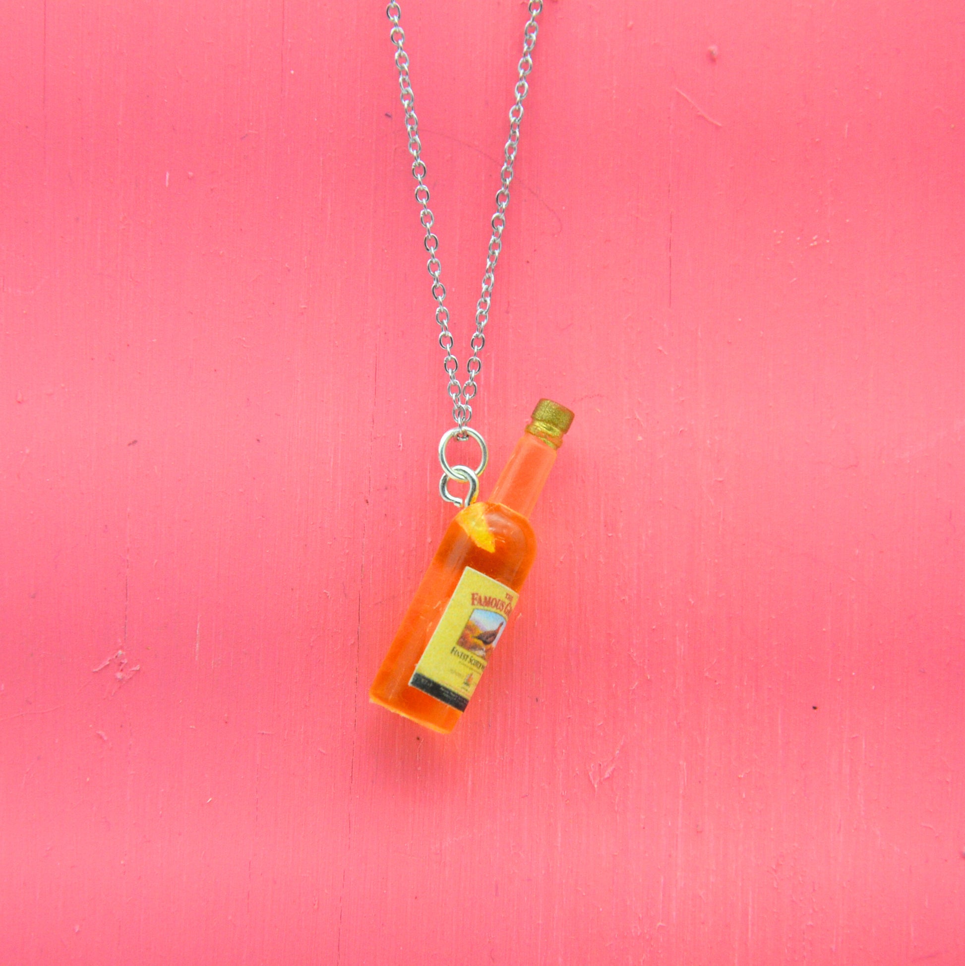 Detta halsband har en flaska, omsorgsfullt återvunnen från en klassisk leksak och nu ett kreativt och hållbart halsband. Den 45 cm långa kedjan är tillverkad av rostfritt stål, vilket ger en bra hållbarhet och är nickelfritt.