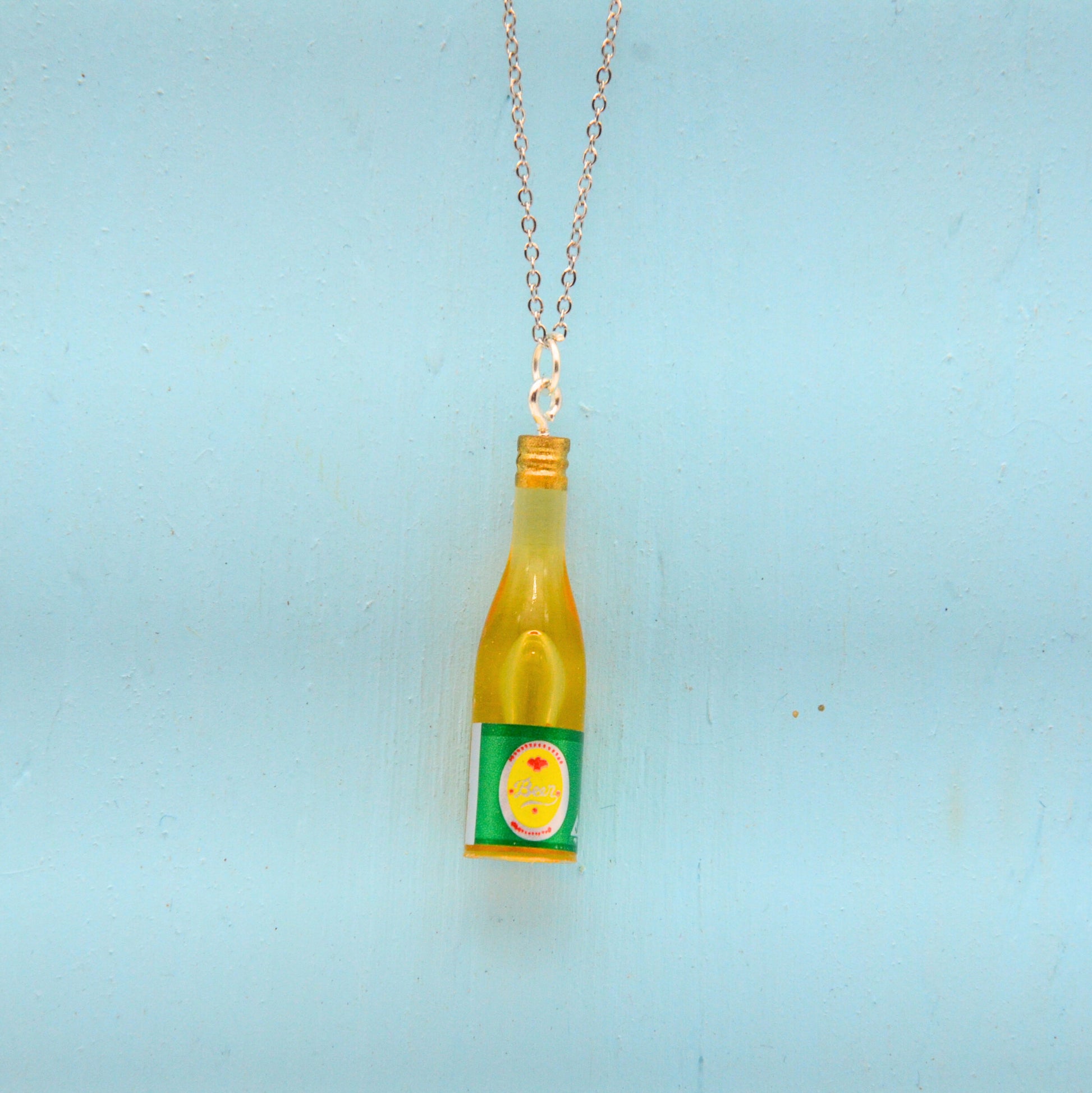 Detta halsband har en liten flaska, omsorgsfullt återvunnen från en klassisk leksak och nu ett kreativt och hållbart halsband. Den 45 cm långa kedjan är tillverkad av rostfritt stål, vilket ger en bra hållbarhet och är nickelfritt.