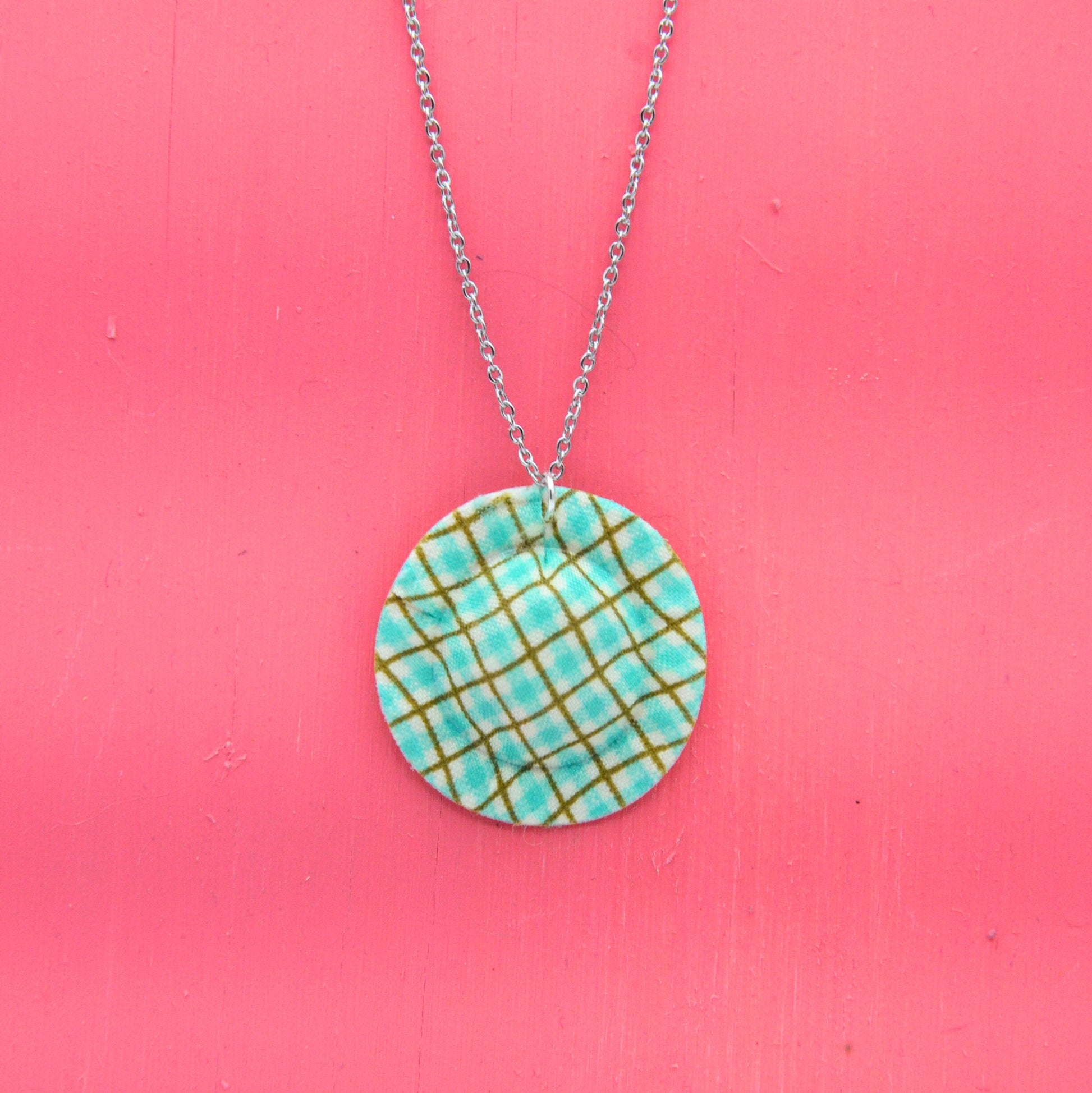 Detta halsband har en grön liten hatt i tyg, omsorgsfullt återvunnen från en klassisk leksak och nu ett kreativt och hållbart halsband. Den 45 cm långa kedjan är tillverkad av rostfritt stål, vilket ger en bra hållbarhet och är nickelfritt.