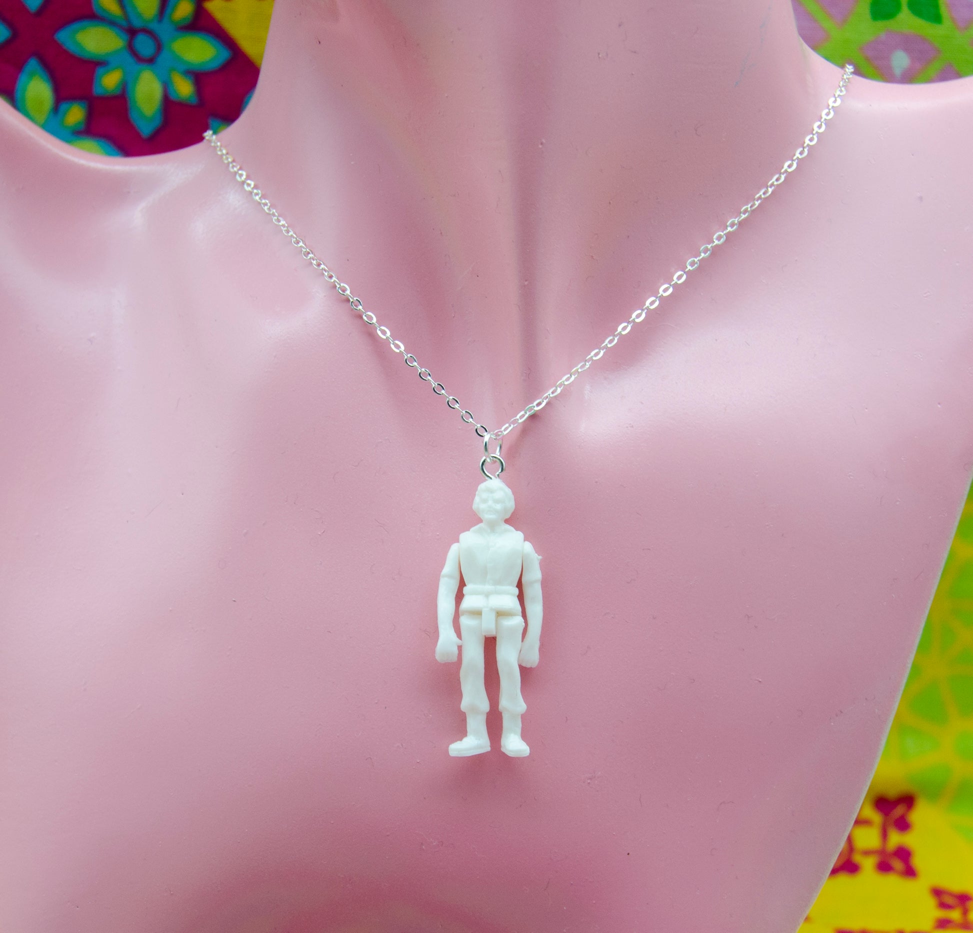Detta halsband har en liten vit dinglande gubbe, omsorgsfullt återvunnen från en klassisk leksak och nu ett kreativt och hållbart halsband. Den 45 cm långa kedjan är tillverkad av rostfritt stål, vilket ger en bra hållbarhet och är nickelfritt.