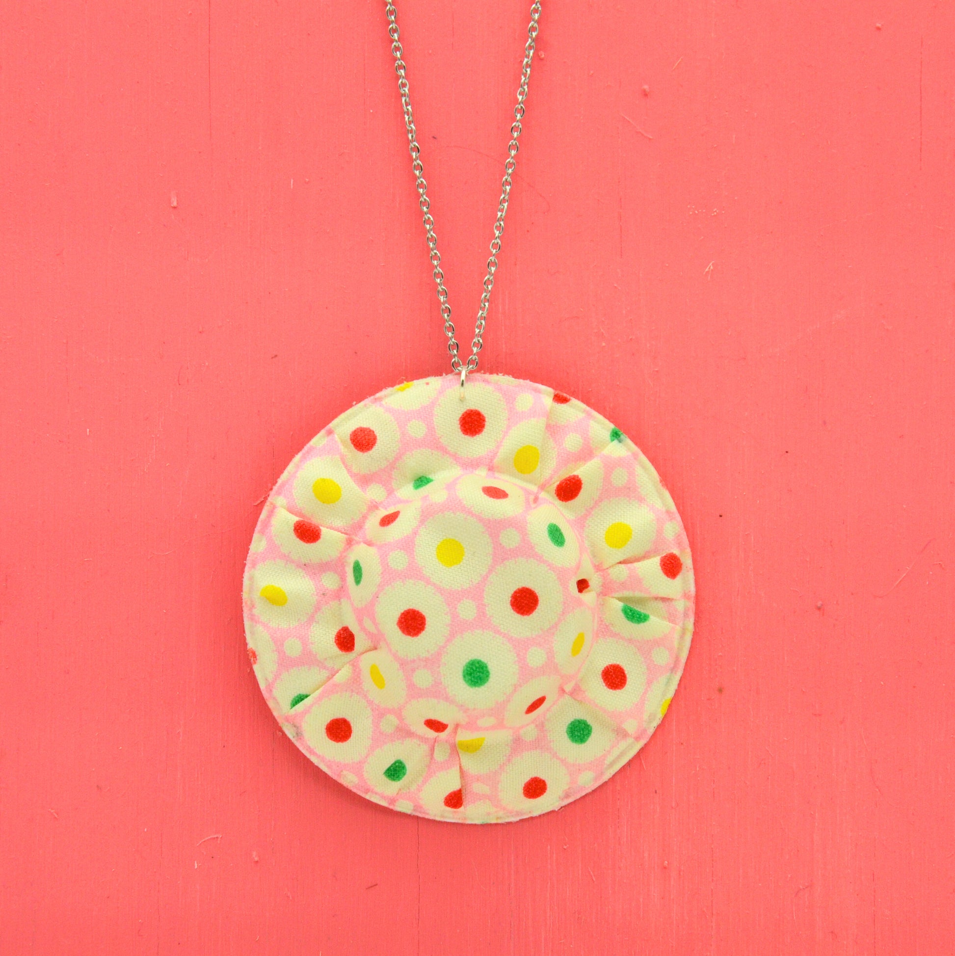 Detta halsband har en prickig tyghatt, omsorgsfullt återvunnen från en klassisk leksak och nu ett kreativt och hållbart halsband. Den 45 cm långa kedjan är tillverkad av rostfritt stål, vilket ger en bra hållbarhet och är nickelfritt.
