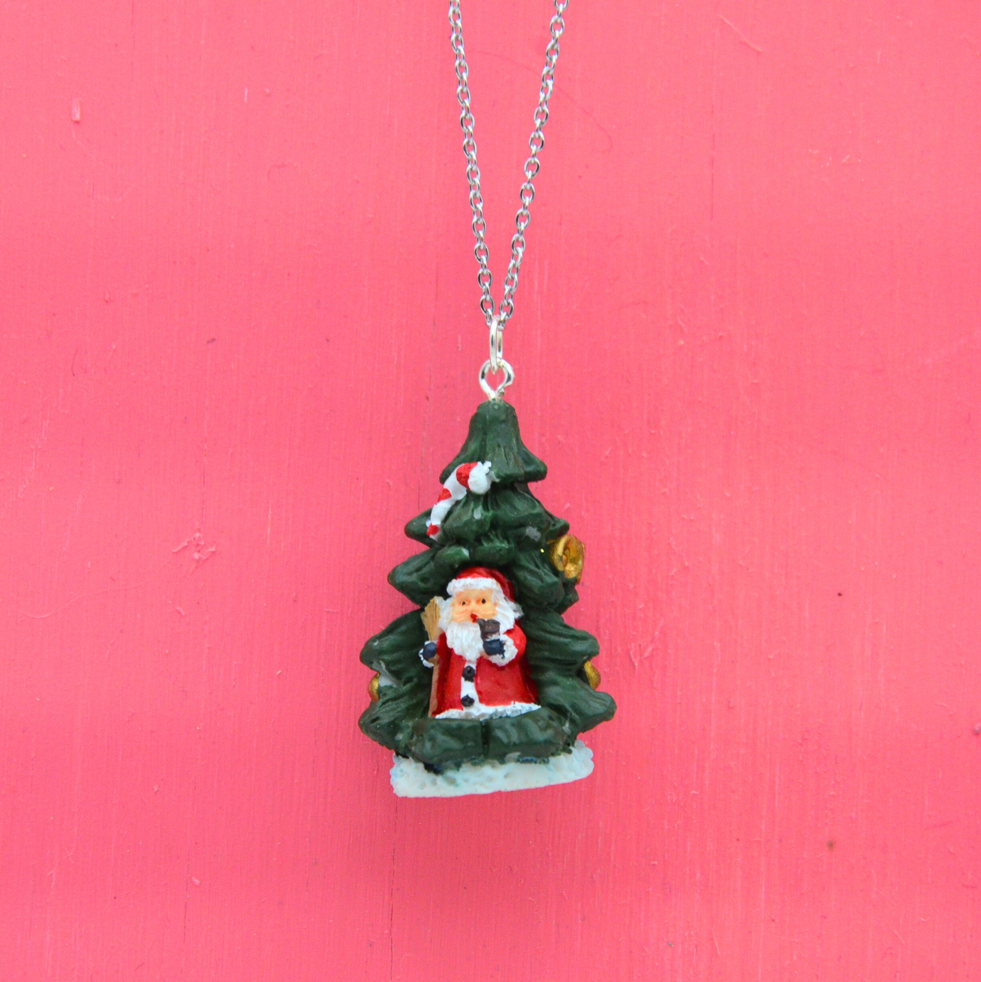 Detta halsband har en julgran med en liten tomte i, omsorgsfullt återvunnen från en klassisk leksak och nu ett kreativt och hållbart halsband. Den 45 cm långa kedjan är tillverkad av rostfritt stål, vilket ger en bra hållbarhet och är nickelfritt.