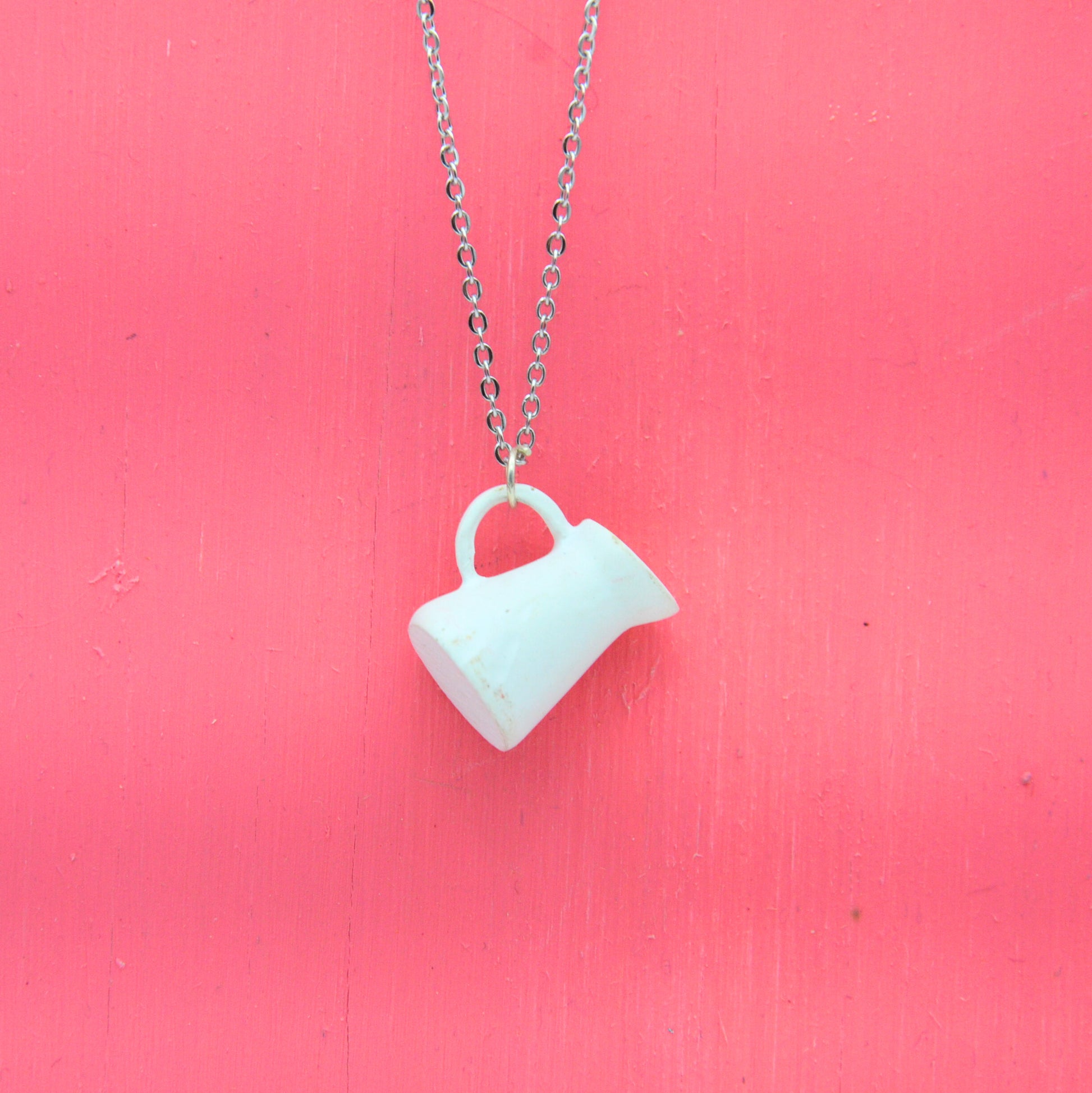 Detta halsband har en vit kanna, omsorgsfullt återvunnen från en klassisk leksak och nu ett kreativt och hållbart halsband. Den 45 cm långa kedjan är tillverkad av rostfritt stål, vilket ger en bra hållbarhet och är nickelfritt.