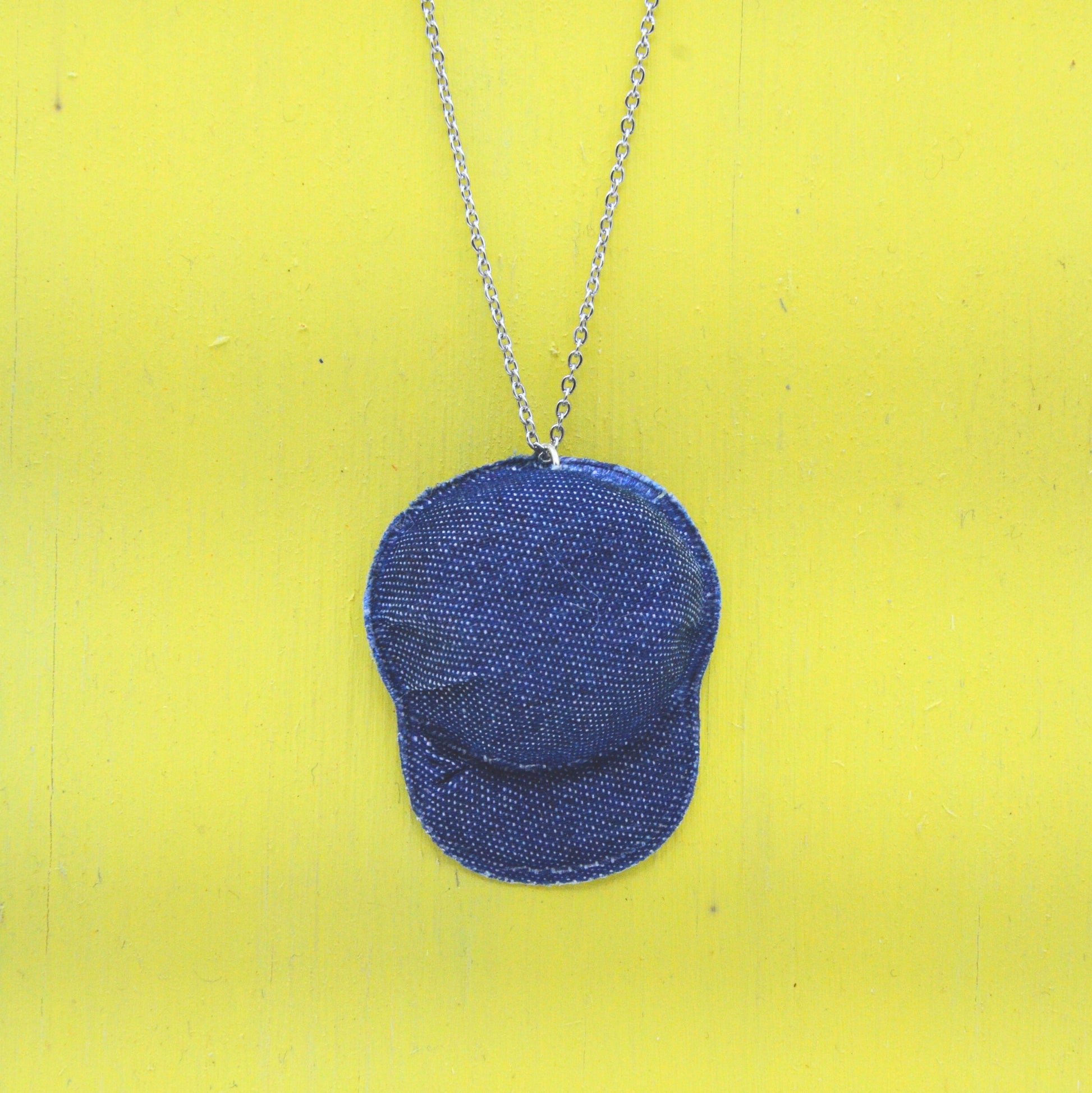Detta halsband har en blå tygkeps, omsorgsfullt återvunnen från en klassisk leksak och nu ett kreativt och hållbart halsband. Den 45 cm långa kedjan är tillverkad av rostfritt stål, vilket ger en bra hållbarhet och är nickelfritt.