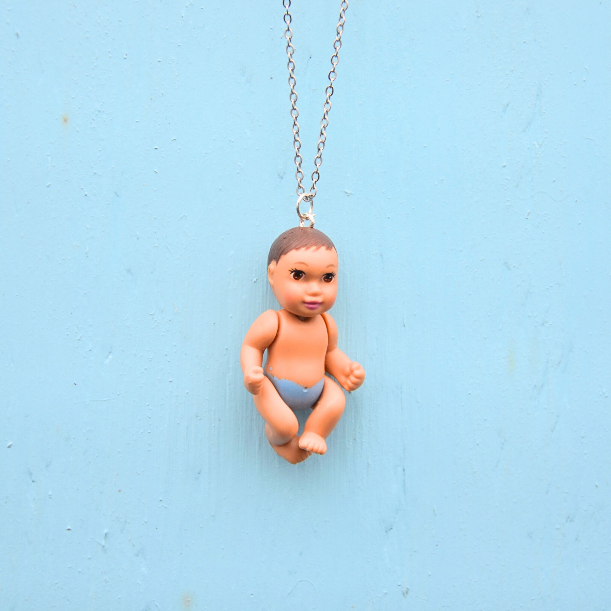 Detta halsband har en charmig bebis, omsorgsfullt återvunnen från en klassisk leksak och nu ett kreativt och hållbart halsband. Den 45 cm långa kedjan är tillverkad av rostfritt stål, vilket ger en bra hållbarhet och är nickelfritt.