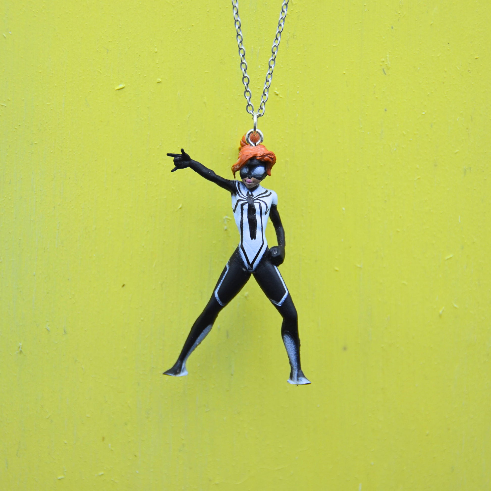 Detta halsband har en She-Venom figur, omsorgsfullt återvunnen från en klassisk leksak och nu ett kreativt och hållbart halsband. Den 45 cm långa kedjan är tillverkad av rostfritt stål, vilket ger en bra hållbarhet och är nickelfritt.