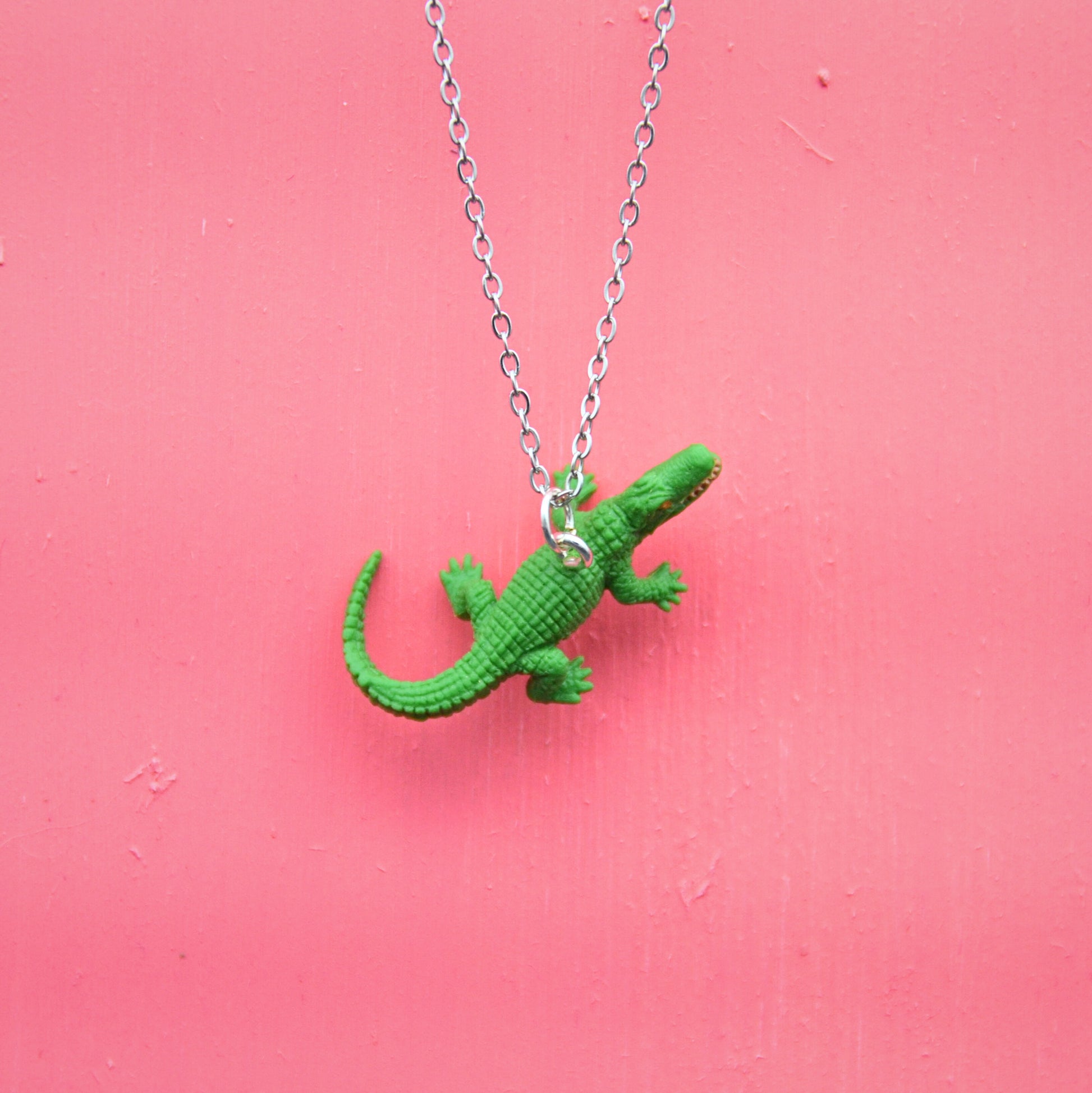 Detta halsband har en mini krokodil, omsorgsfullt återvunnen från en klassisk leksak och nu ett kreativt och hållbart halsband. Den 45 cm långa kedjan är tillverkad av rostfritt stål, vilket ger en bra hållbarhet och är nickelfritt.
