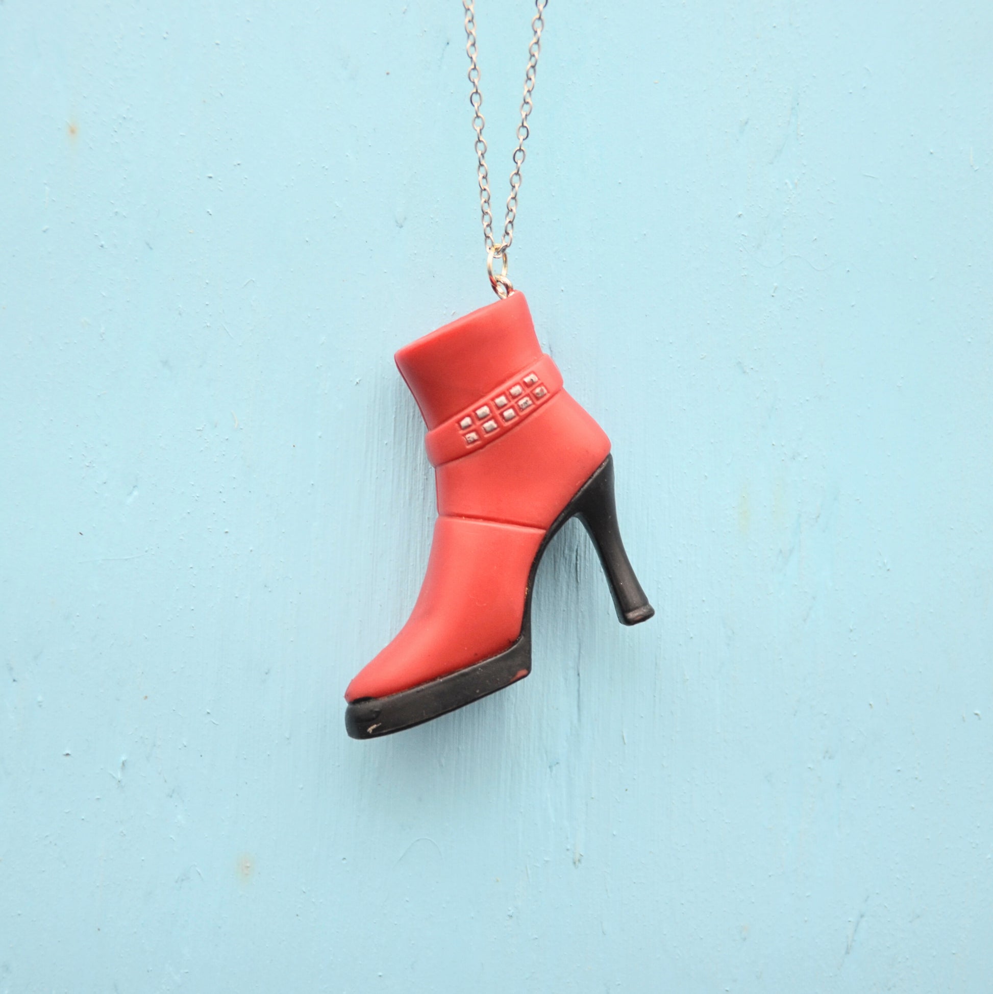 Detta halsband har en röd sko, omsorgsfullt återvunnen från en klassisk leksak och nu ett kreativt och hållbart halsband. Den 45 cm långa kedjan är tillverkad av rostfritt stål, vilket ger en bra hållbarhet och är nickelfritt.