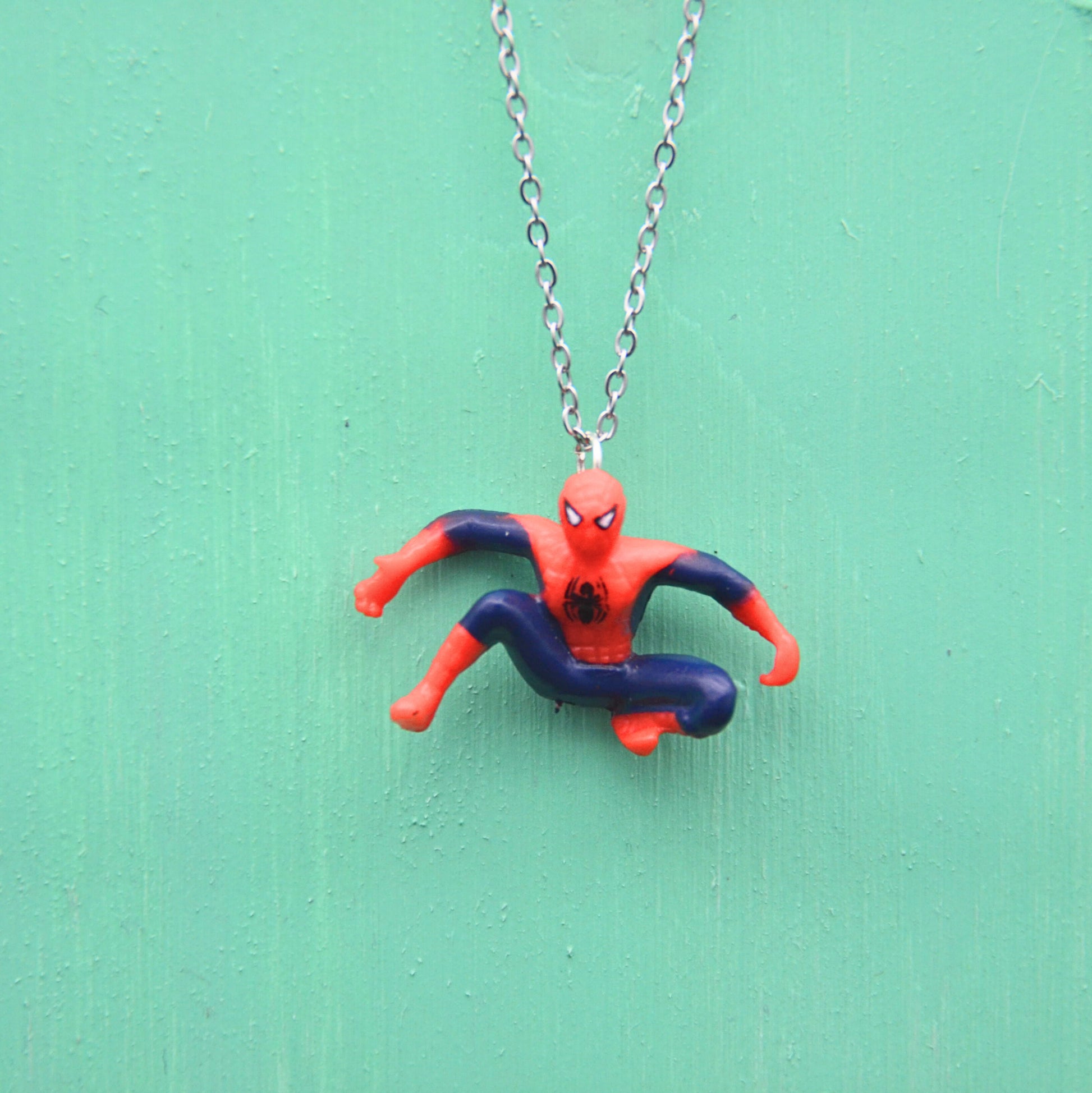 Detta halsband har en spider-man figur, omsorgsfullt återvunnen från en klassisk leksak och nu ett kreativt och hållbart halsband. Den 45 cm långa kedjan är tillverkad av rostfritt stål, vilket ger en bra hållbarhet och är nickelfritt.