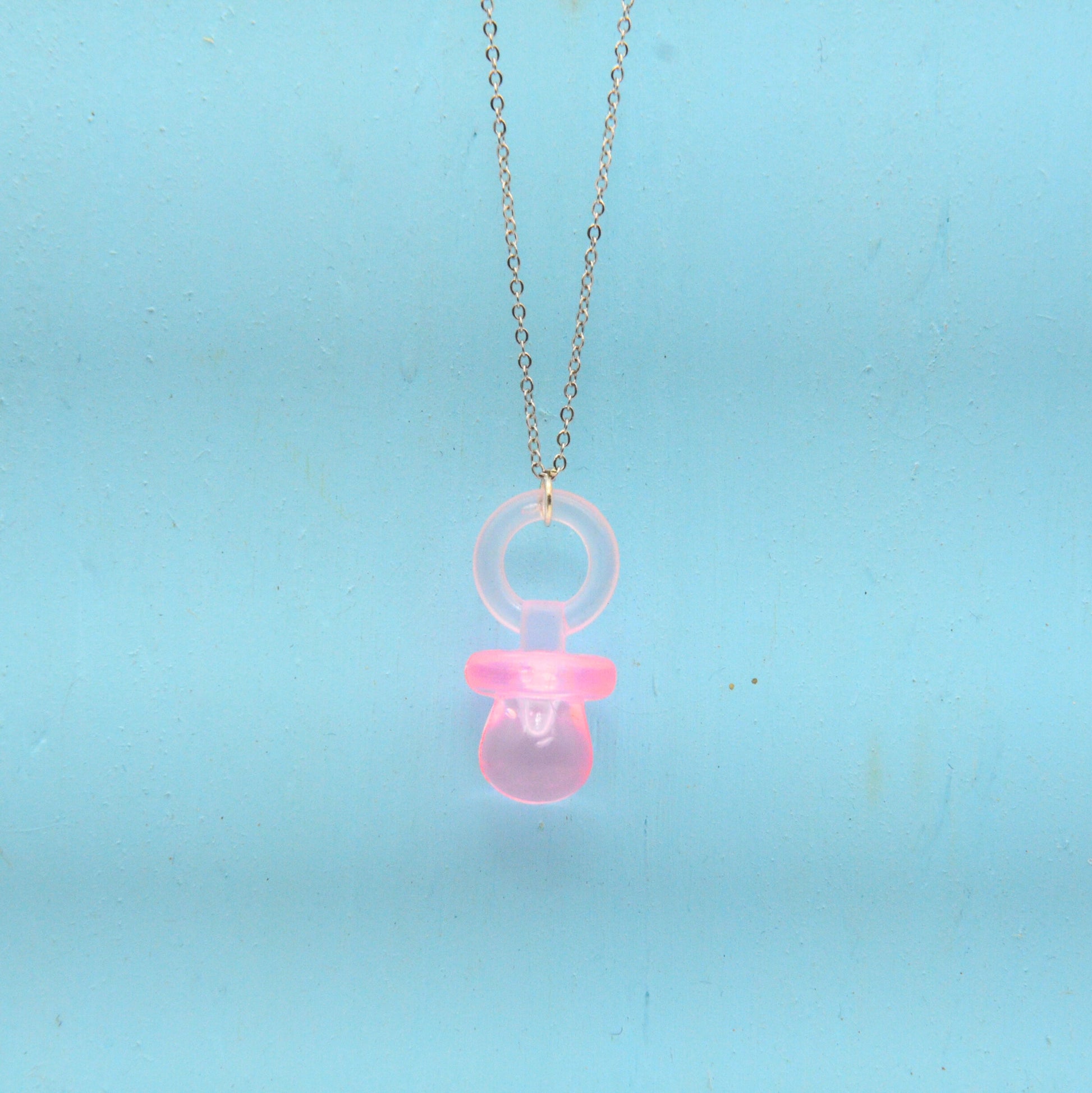 Detta halsband har en liten rosa napp, omsorgsfullt återvunnen från en klassisk leksak och nu ett kreativt och hållbart halsband. Den 45 cm långa kedjan är tillverkad av rostfritt stål, vilket ger en bra hållbarhet och är nickelfritt.