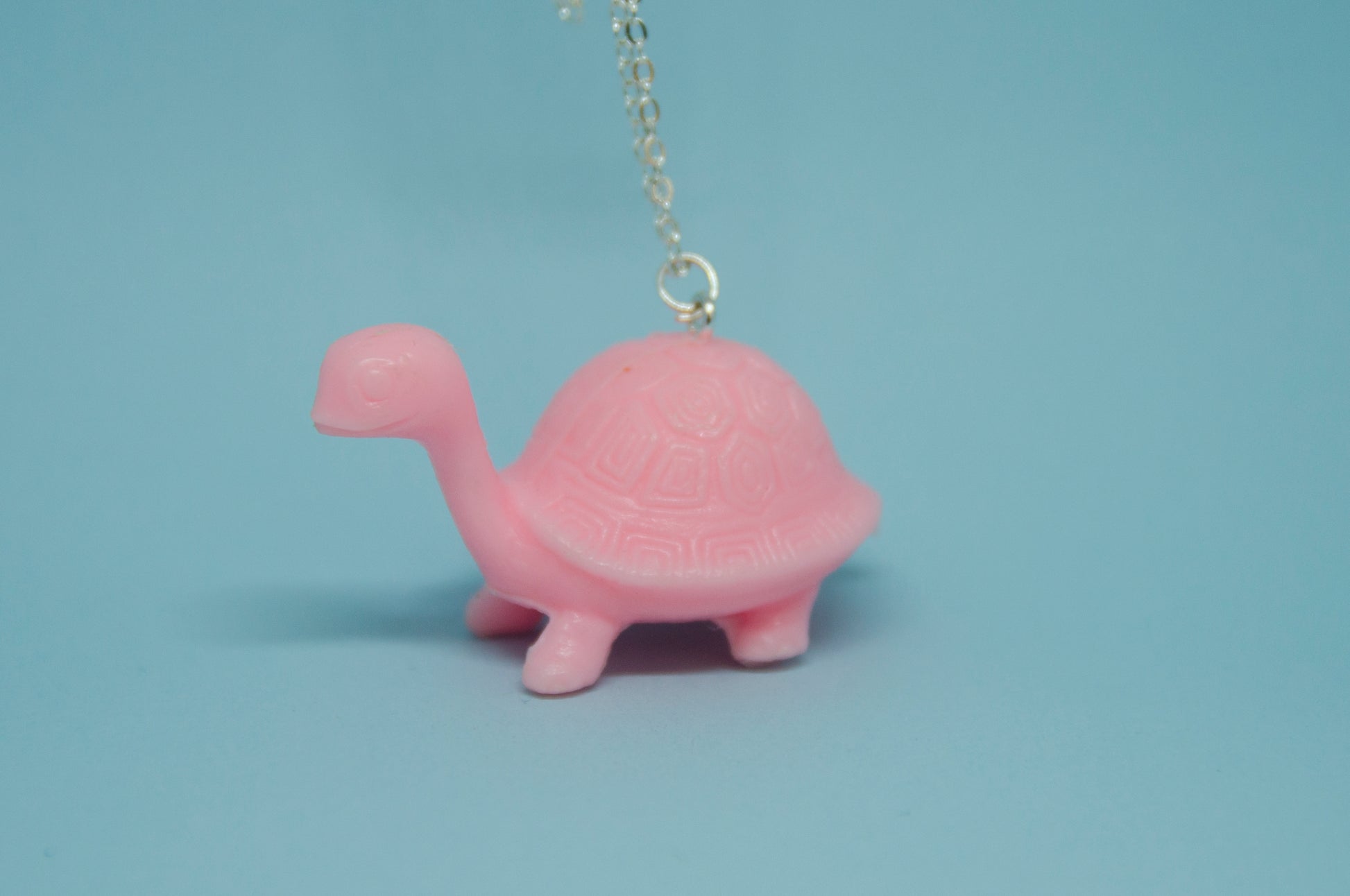 Detta halsband har en rosa sköldpadda, omsorgsfullt återvunnen från en klassisk leksak och nu ett kreativt och hållbart halsband. Den 45 cm långa kedjan är tillverkad av rostfritt stål, vilket ger en bra hållbarhet och är nickelfritt.