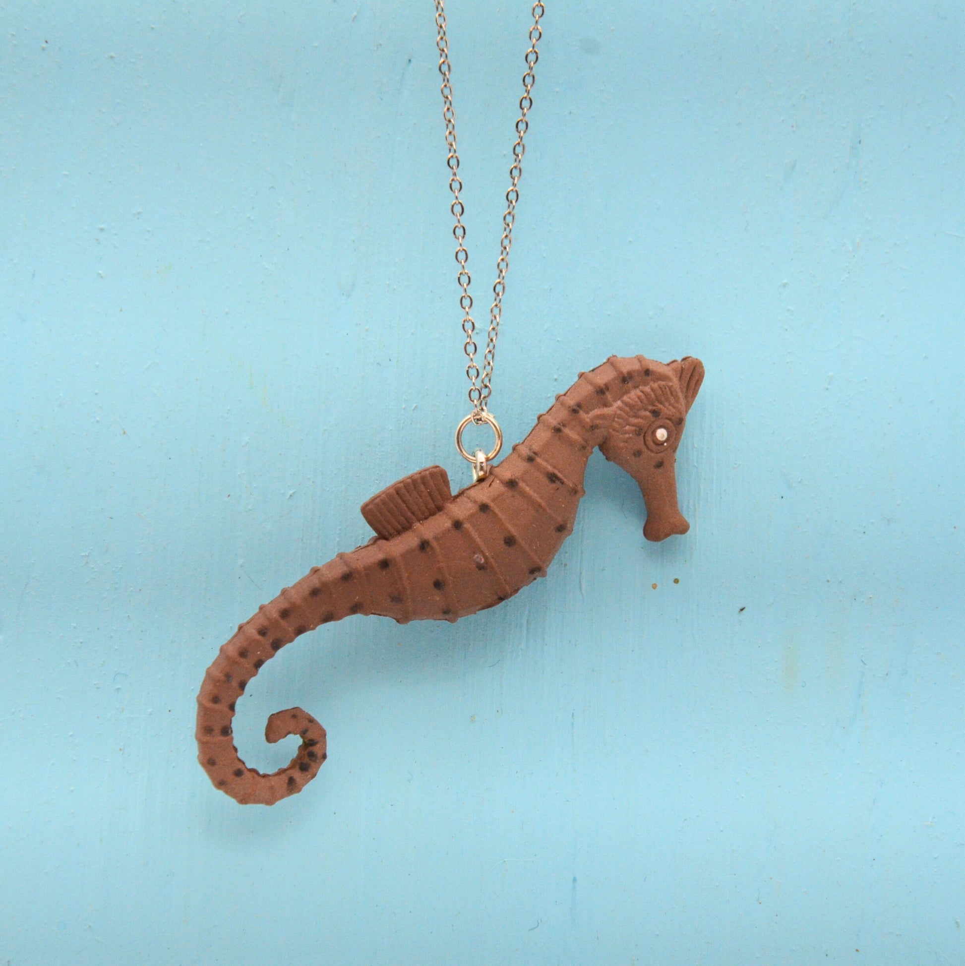 Detta halsband har en sjöhäst, omsorgsfullt återvunnen från en klassisk leksak och nu ett kreativt och hållbart halsband. Den 45 cm långa kedjan är tillverkad av rostfritt stål, vilket ger en bra hållbarhet och är nickelfritt.