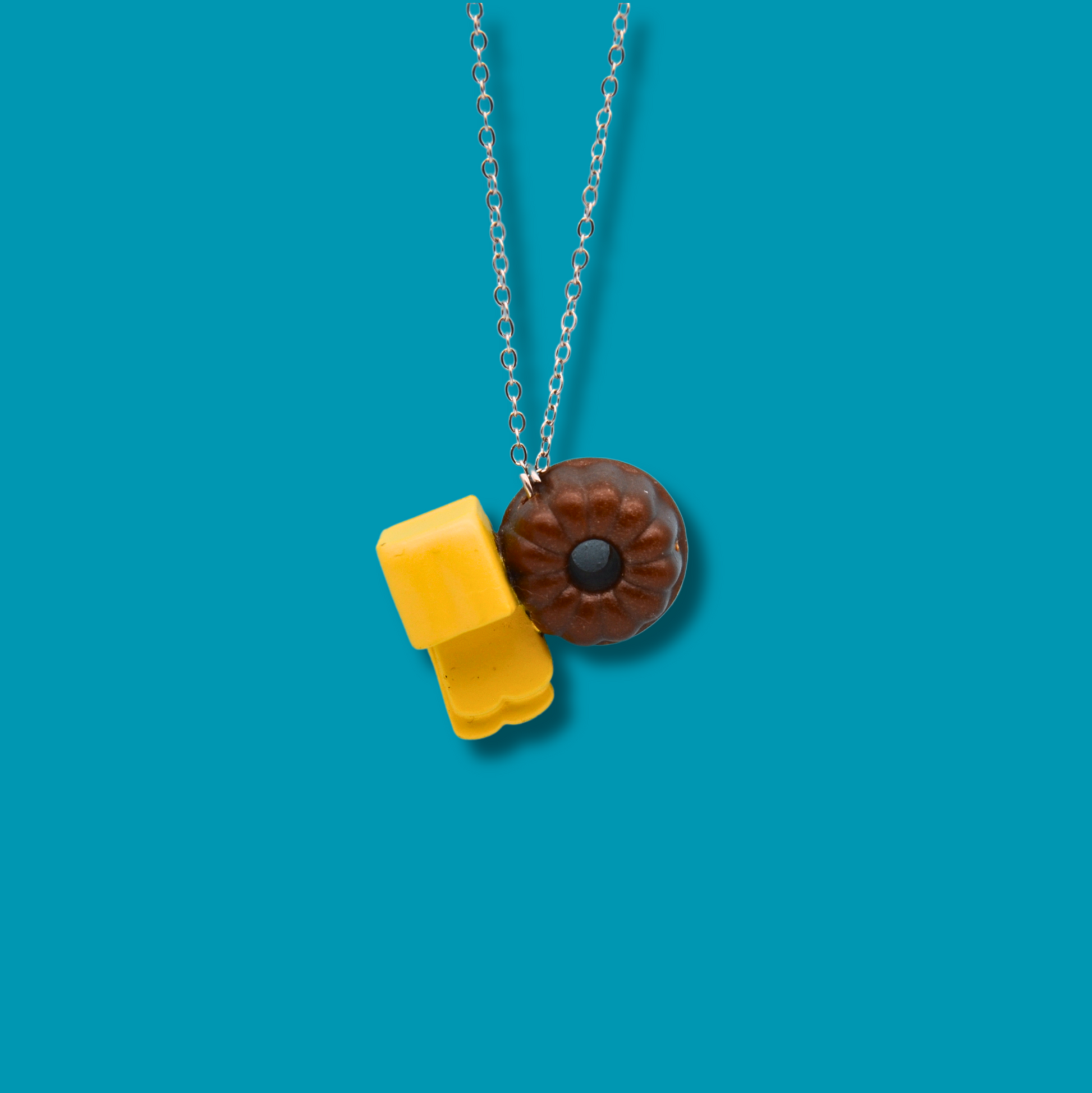Detta halsband är en liten sockerkaka, omsorgsfullt återvunnen från en klassisk leksak och nu ett kreativt och hållbart halsband. Den 45 cm långa kedjan är tillverkad av rostfritt stål, vilket ger en bra hållbarhet och är nickelfritt.