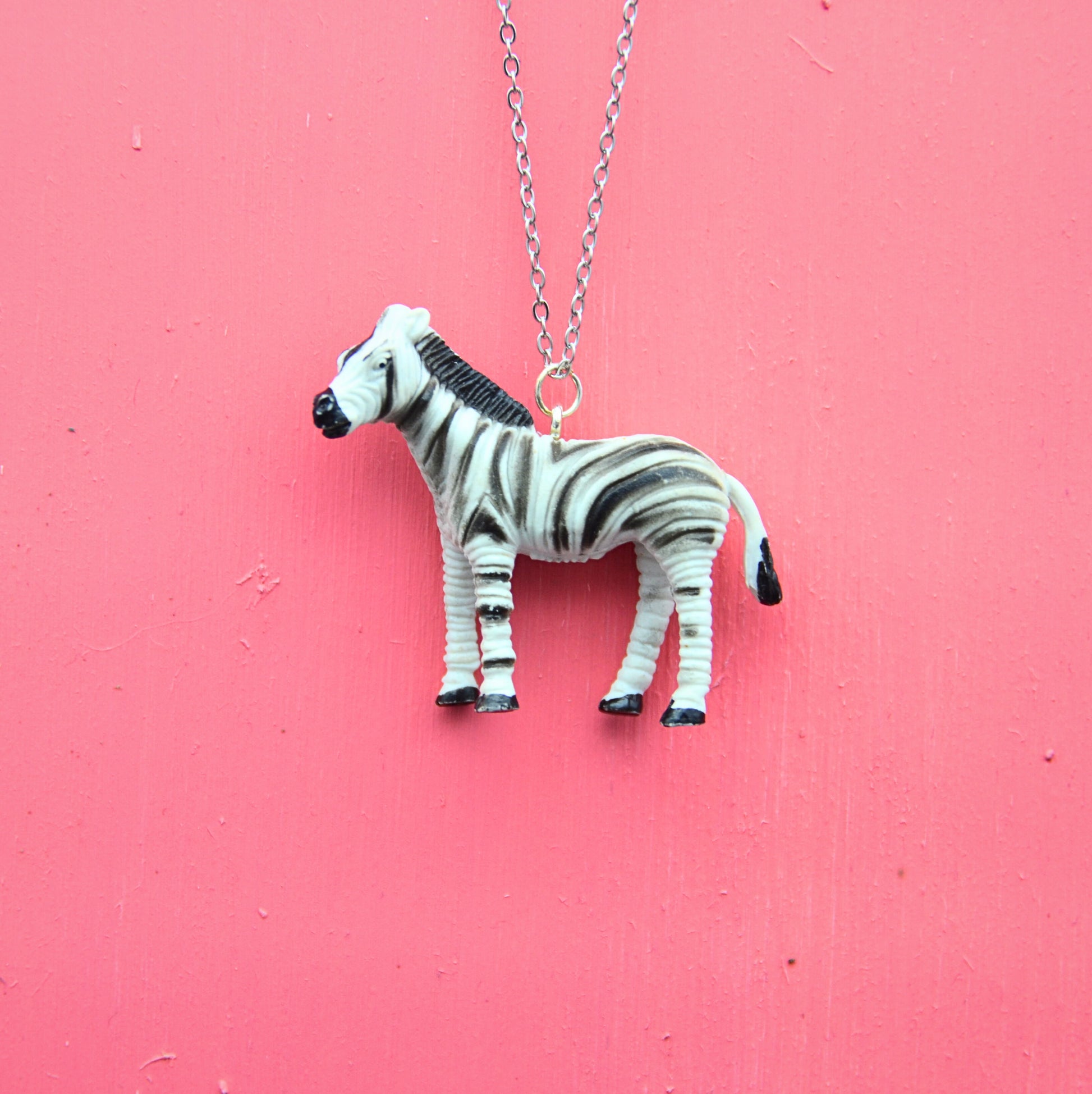 Detta halsband har en zebra, omsorgsfullt återvunnen från en klassisk leksak och nu ett kreativt och hållbart halsband. Den 45 cm långa kedjan är tillverkad av rostfritt stål, vilket ger en bra hållbarhet och är nickelfritt.