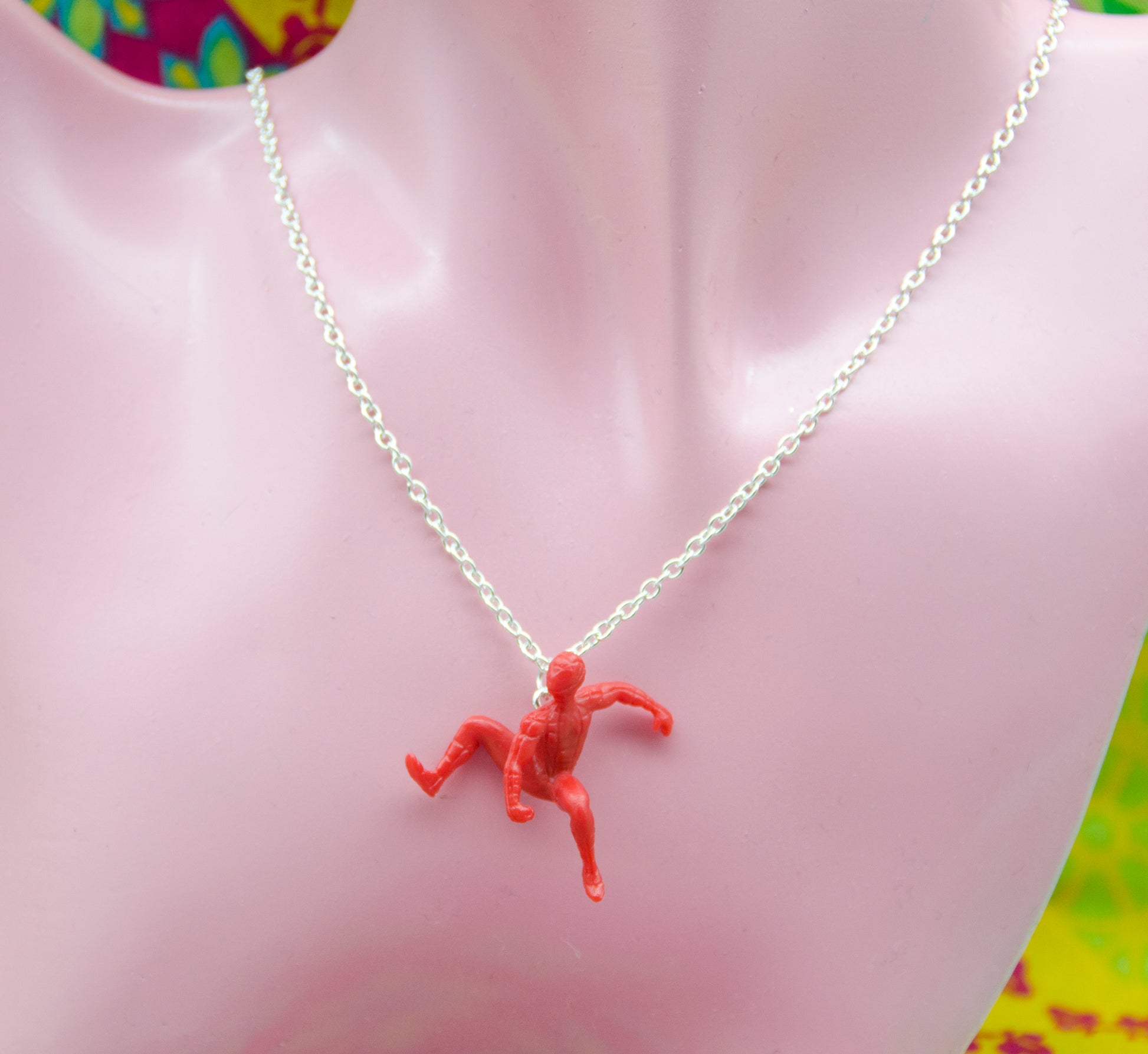 Detta halsband har en röd spider-man, omsorgsfullt återvunnen från en klassisk leksak och nu ett kreativt och hållbart halsband. Den 45 cm långa kedjan är tillverkad av rostfritt stål, vilket ger en bra hållbarhet och är nickelfritt.