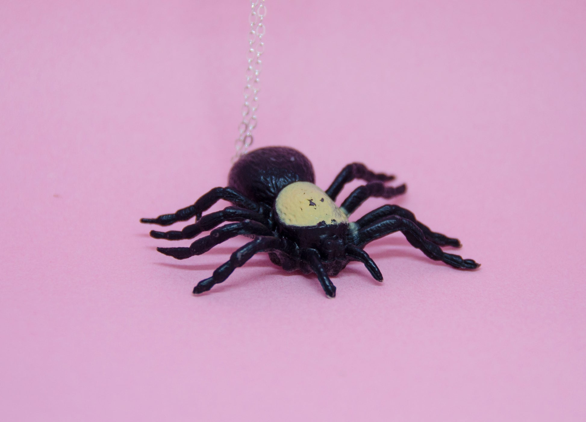 Detta halsband har en spindel, omsorgsfullt återvunnen från en klassisk leksak och nu ett kreativt och hållbart halsband. Den 45 cm långa kedjan är tillverkad av rostfritt stål, vilket ger en bra hållbarhet och är nickelfritt.