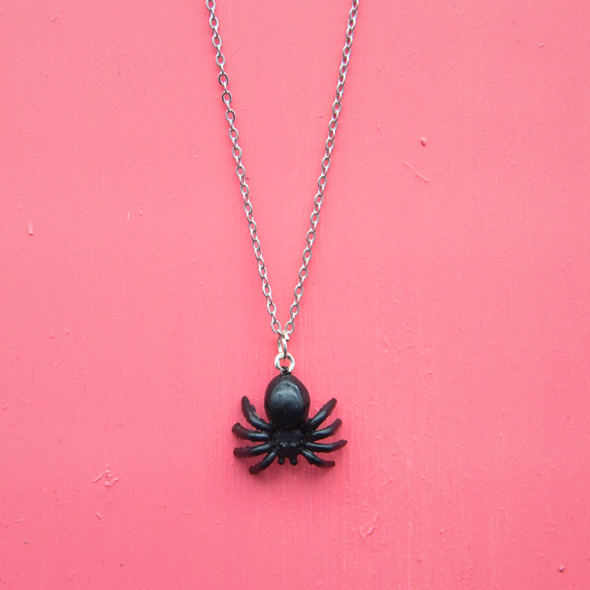 Detta halsband har en spindel, omsorgsfullt återvunnen från en klassisk leksak och nu ett kreativt och hållbart halsband. Den 45 cm långa kedjan är tillverkad av rostfritt stål, vilket ger en bra hållbarhet och är nickelfritt.