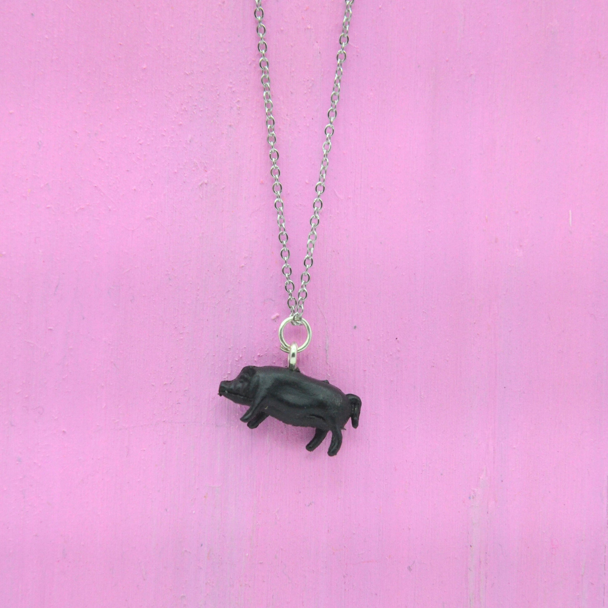 Detta halsband har en liten svart gris, omsorgsfullt återvunnen från en klassisk leksak och nu ett kreativt och hållbart halsband. Den 45 cm långa kedjan är tillverkad av rostfritt stål, vilket ger en bra hållbarhet och är nickelfritt.