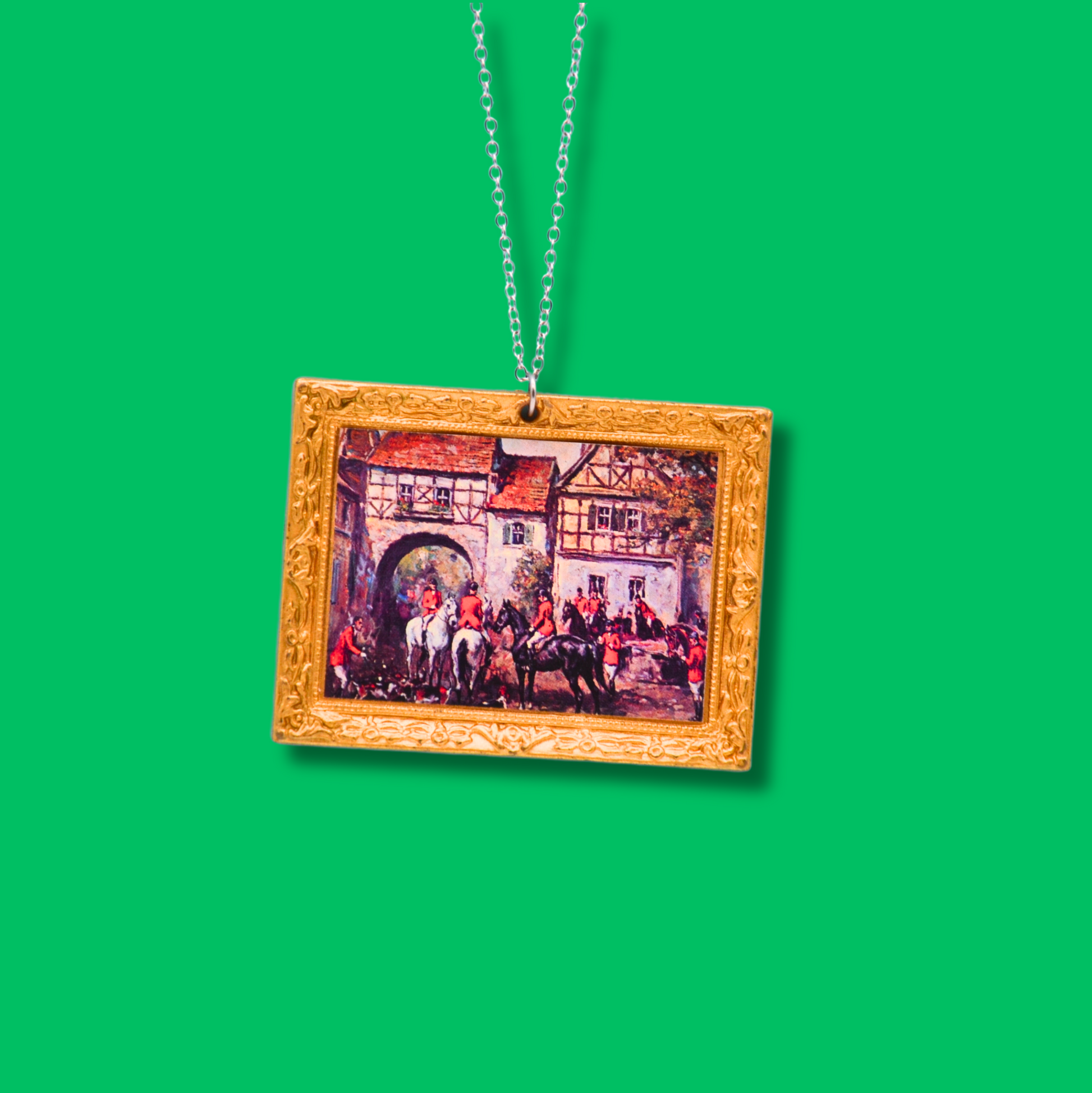 Detta halsband är en fin tavla med guldram, omsorgsfullt återvunnen från en klassisk leksak och nu ett kreativt och hållbart halsband. Den 45 cm långa kedjan är tillverkad av rostfritt stål, vilket ger en bra hållbarhet och är nickelfritt.