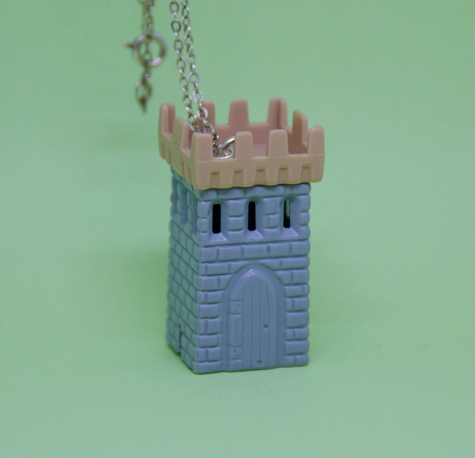 Detta halsband har ett torn, omsorgsfullt återvunnen från en klassisk leksak och nu ett kreativt och hållbart halsband. Den 45 cm långa kedjan är tillverkad av rostfritt stål, vilket ger en bra hållbarhet och är nickelfritt.