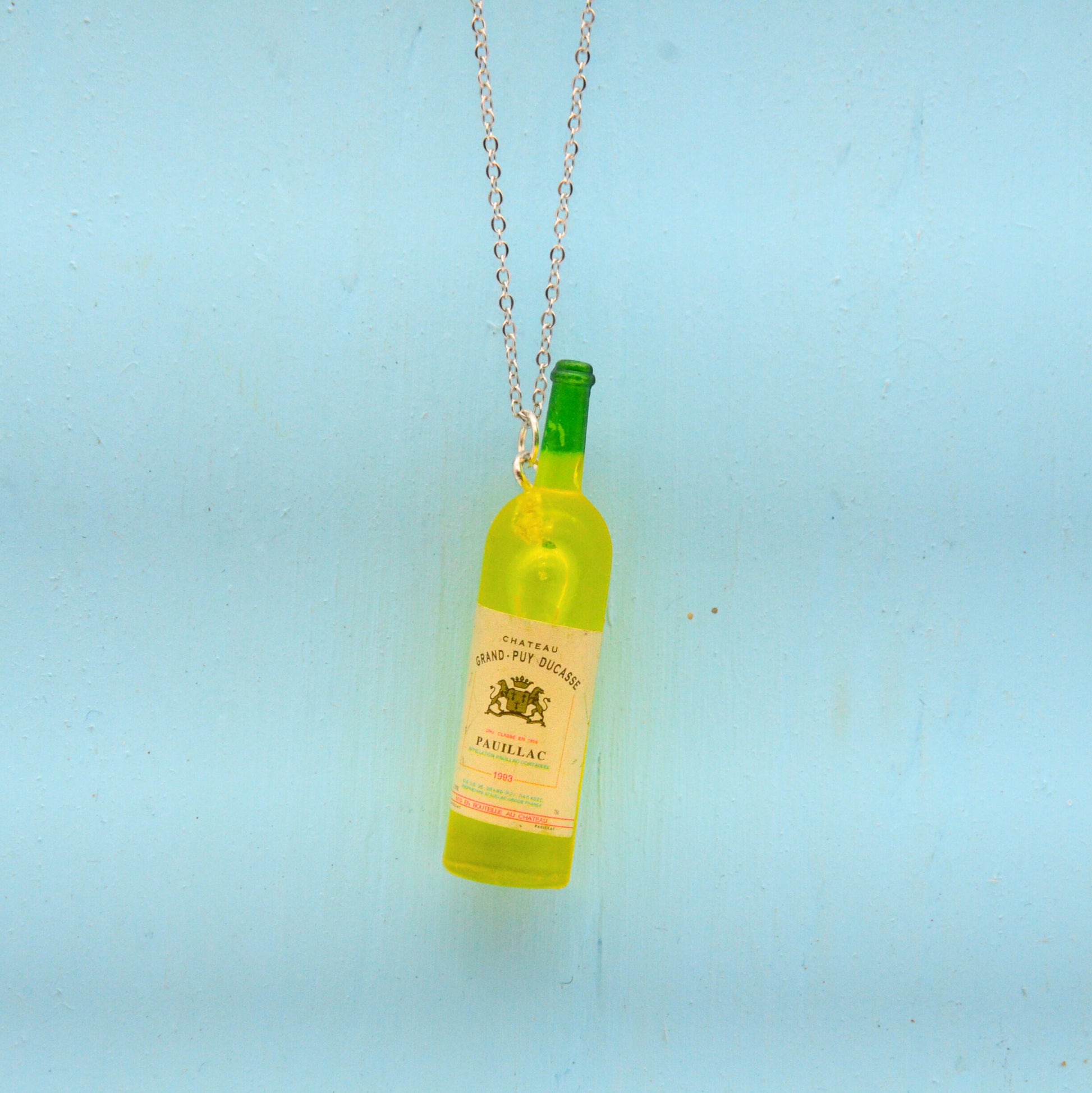 Detta halsband har en liten vinflaska, omsorgsfullt återvunnen från en klassisk leksak och nu ett kreativt och hållbart halsband. Den 45 cm långa kedjan är tillverkad av rostfritt stål, vilket ger en bra hållbarhet och är nickelfritt.