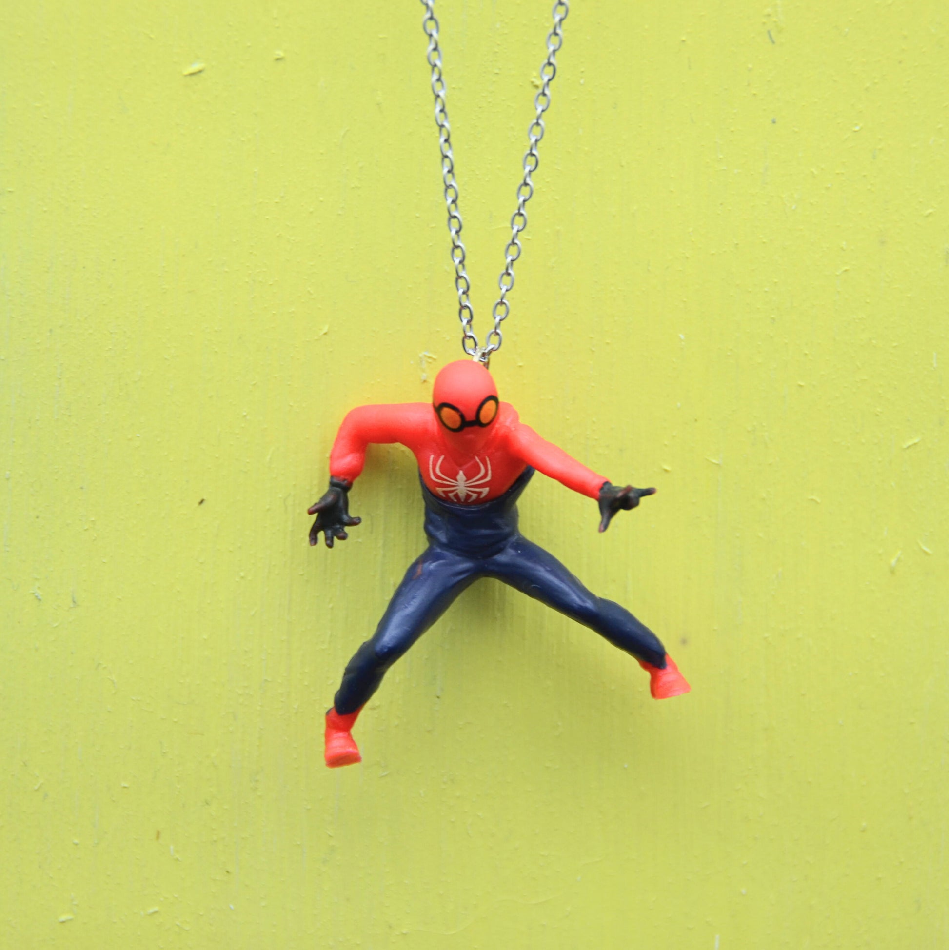 Detta halsband har en spider-man figur, omsorgsfullt återvunnen från en klassisk leksak och nu ett kreativt och hållbart halsband. Den 45 cm långa kedjan är tillverkad av rostfritt stål, vilket ger en bra hållbarhet och är nickelfritt.