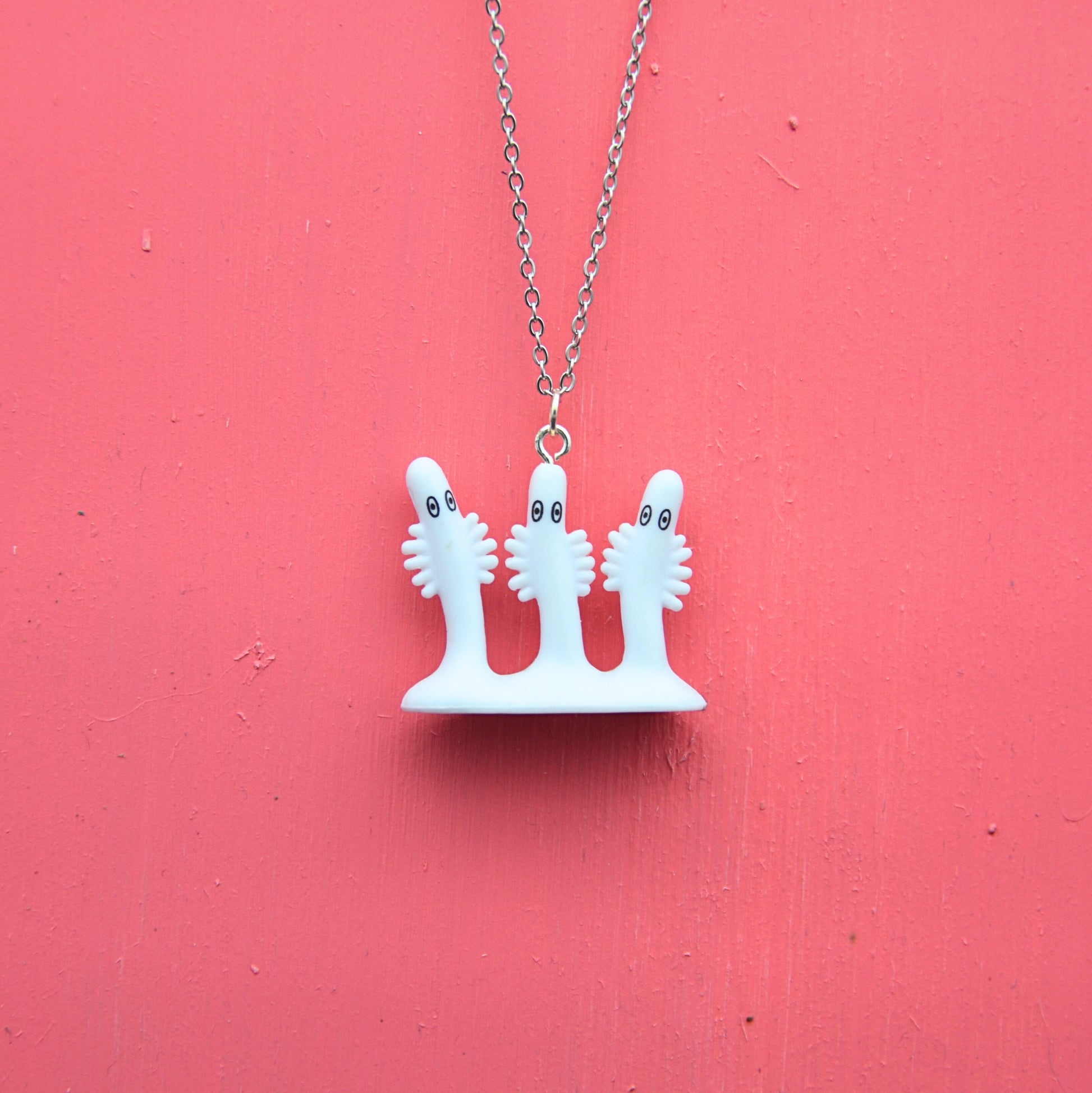 Detta halsband har vita figurer, omsorgsfullt återvunnen från en klassisk leksak och nu ett kreativt och hållbart halsband. Den 45 cm långa kedjan är tillverkad av rostfritt stål, vilket ger en bra hållbarhet och är nickelfritt.