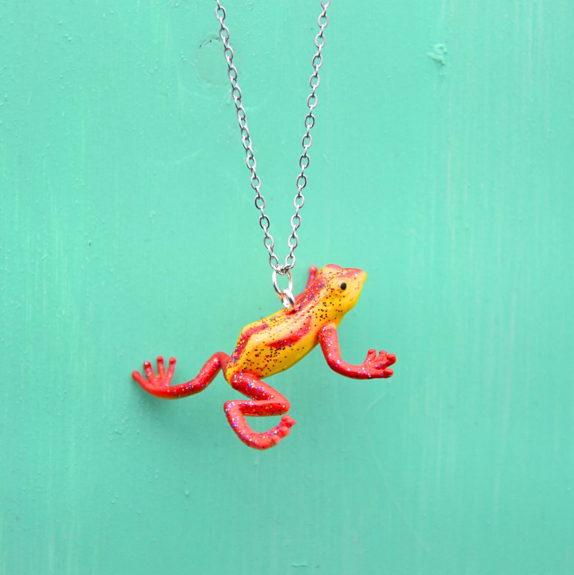 Detta halsband har en röd glittrig groda, omsorgsfullt återvunnen från en klassisk leksak och nu ett kreativt och hållbart halsband. Den 45 cm långa kedjan är tillverkad av rostfritt stål, vilket ger en bra hållbarhet och är nickelfritt.