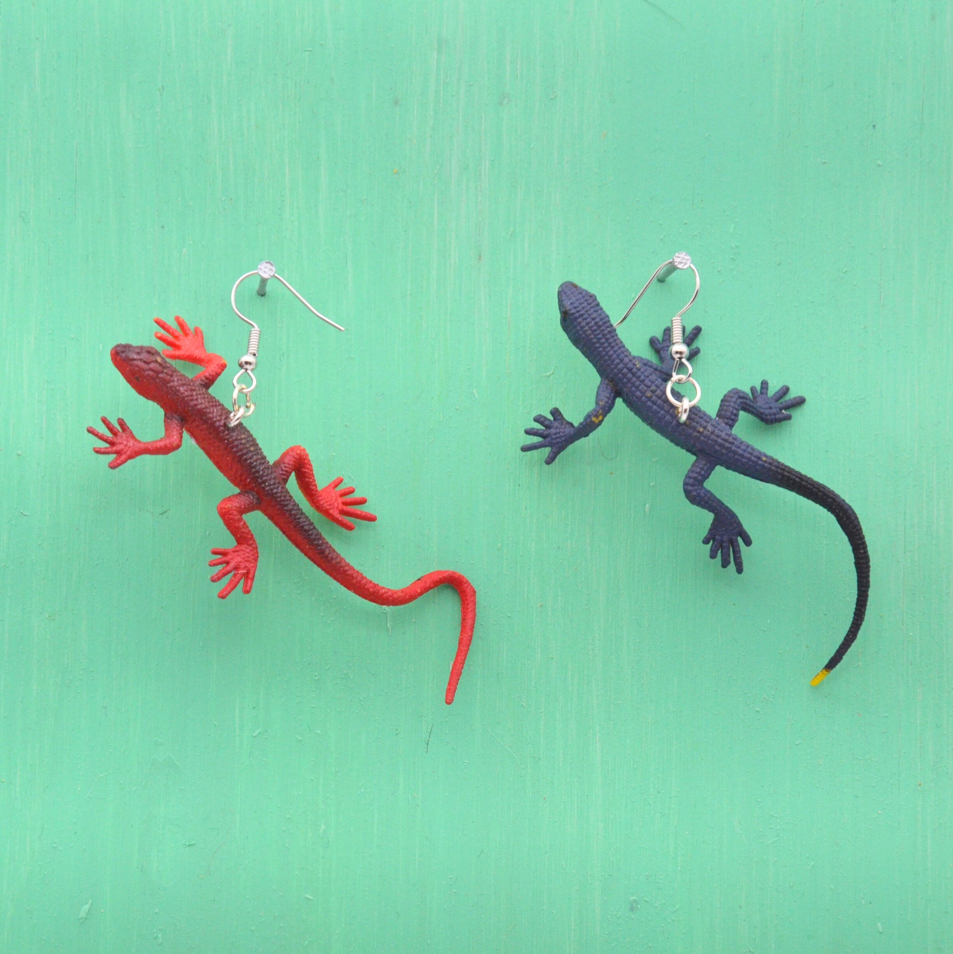 Dessa örhängen är ett par ödlor, omsorgsfullt återvunna från klassiska leksaker och nu ett par kreativt och hållbara örhängen. Hängerna är tillverkade av rostfritt stål, vilket ger en bra hållbarhet och är nickelfria.