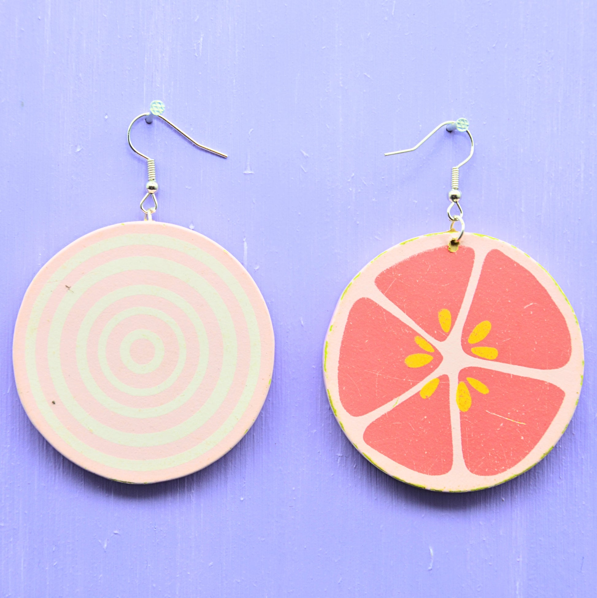 Dessa örhängen är ett par frukter i trä, omsorgsfullt återvunna från klassiska leksaker och nu ett par kreativt och hållbara örhängen. Hängena är tillverkade av rostfritt stål, vilket ger en bra hållbarhet och är nickelfria.