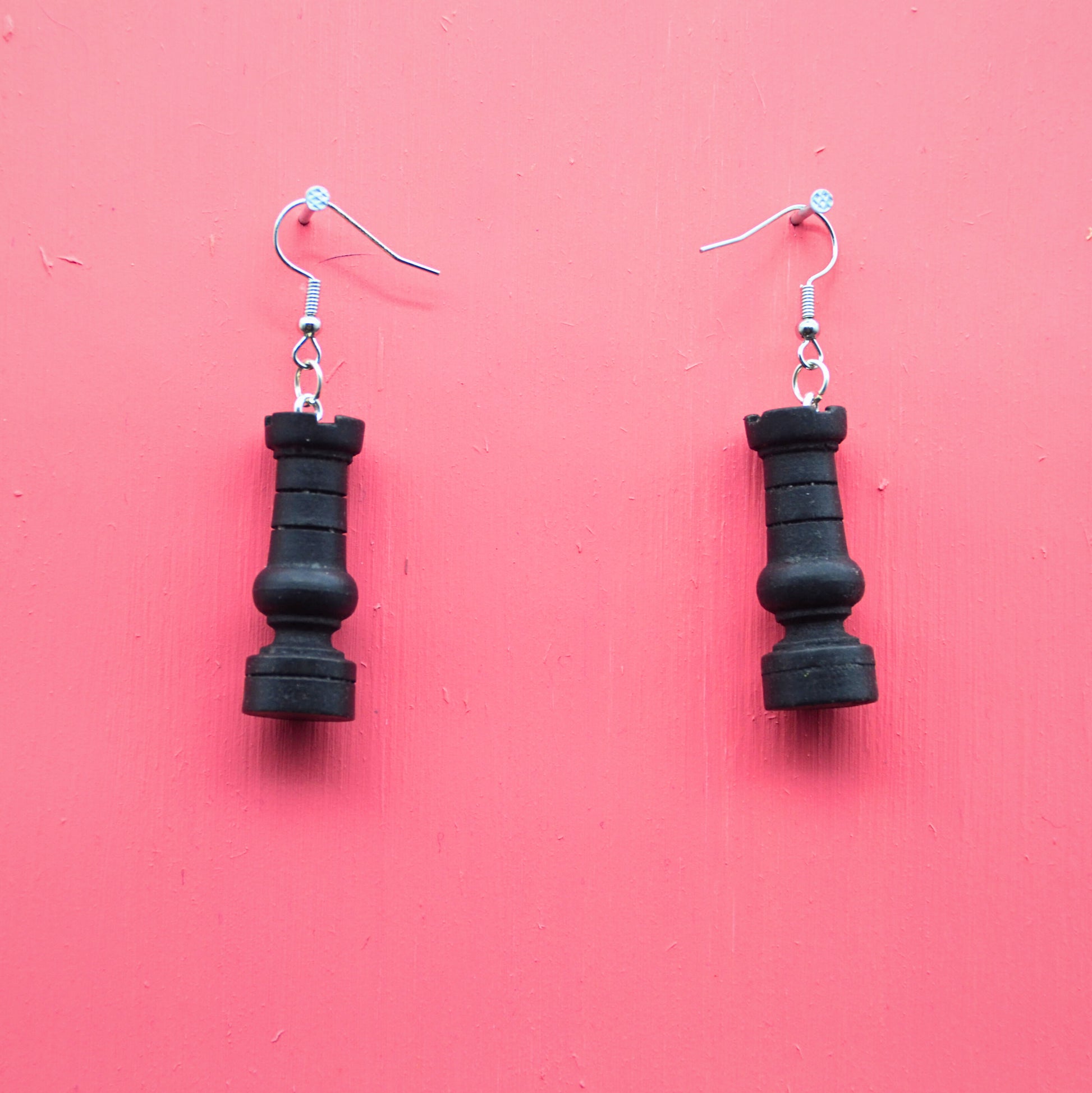Dessa örhängen är ett par schackpjäser, omsorgsfullt återvunna från klassiska leksaker och nu ett par kreativt och hållbara örhängen. Hängena är tillverkade av rostfritt stål, vilket ger en bra hållbarhet och är nickelfria.