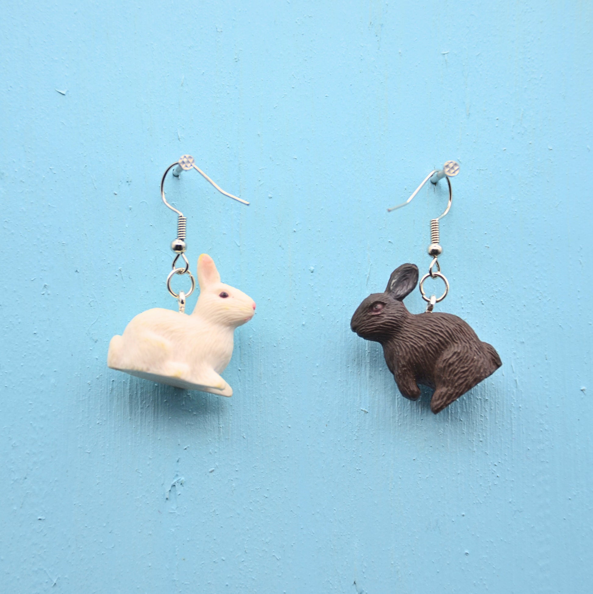 Dessa örhängen är ett par kaniner, omsorgsfullt återvunna från klassiska leksaker och nu ett par kreativt och hållbara örhängen. Hängena är tillverkade av rostfritt stål, vilket ger en bra hållbarhet och är nickelfria.