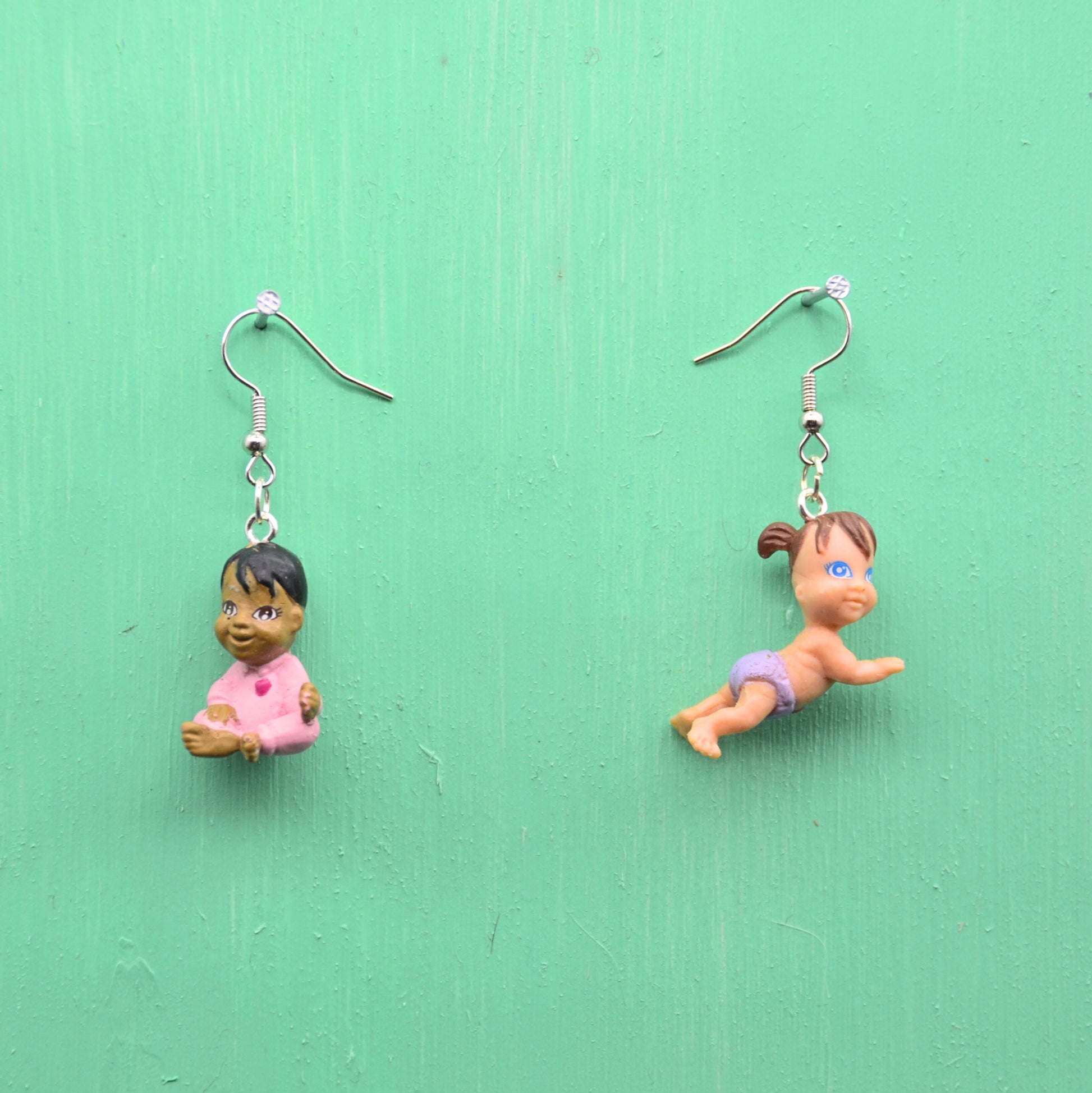 Dessa örhängen är ett par bebisar, omsorgsfullt återvunna från klassiska leksaker och nu ett par kreativt och hållbara örhängen. Hängena är tillverkade av rostfritt stål, vilket ger en bra hållbarhet och är nickelfria.