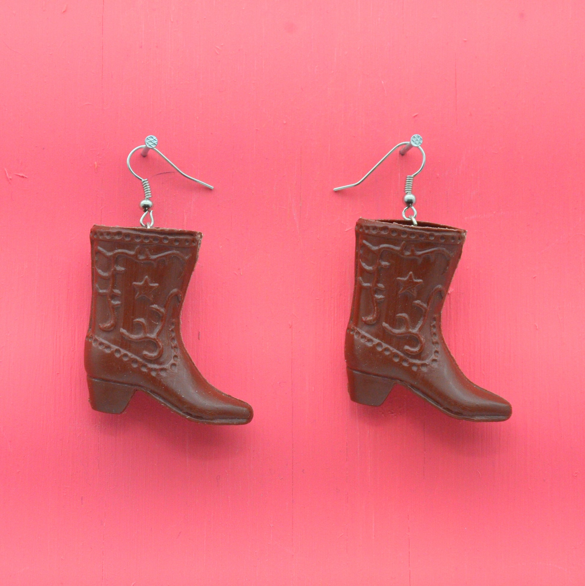 Dessa örhängen är ett par bruna cowboyboots, omsorgsfullt återvunna från klassiska leksaker och nu ett par kreativt och hållbara örhängen. Hängena är tillverkade av rostfritt stål, vilket ger en bra hållbarhet och är nickelfria.