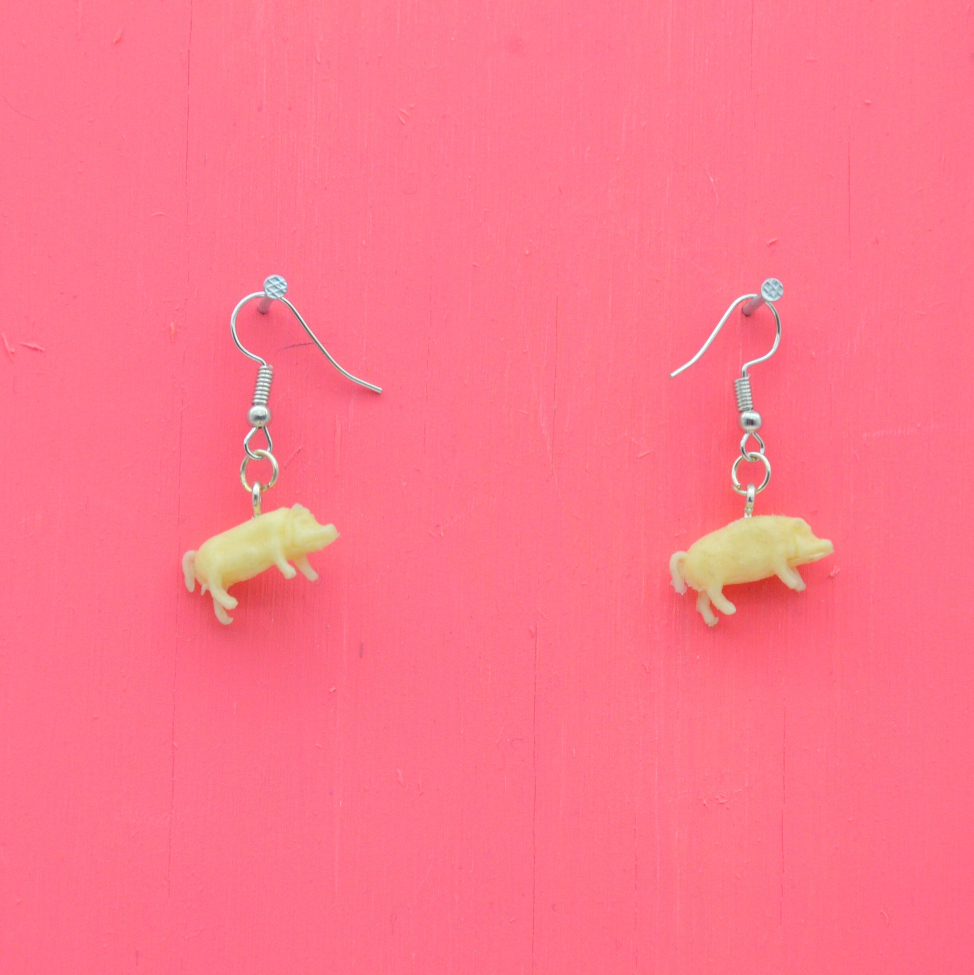 Dessa örhängen är ett par söta små grisar, omsorgsfullt återvunna från klassiska leksaker och nu ett par kreativt och hållbara örhängen. Hängena är tillverkade av rostfritt stål, vilket ger en bra hållbarhet och är nickelfria.