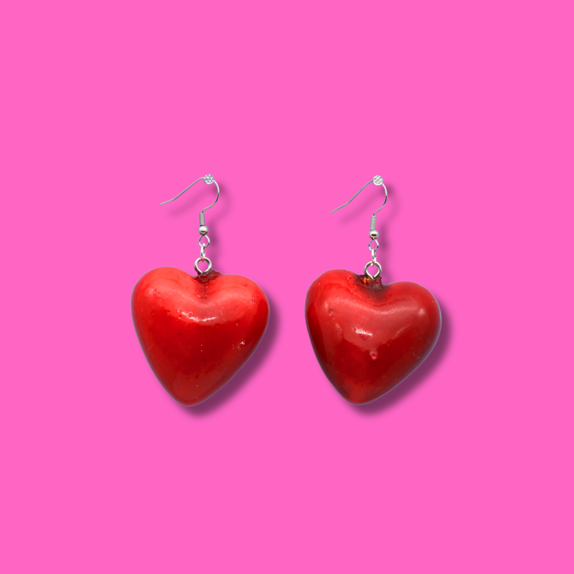 Dessa örhängen är ett par röda hjärtan, omsorgsfullt återvunna från klassiska dekorationer och nu ett par kreativt och hållbara örhängen. Hängena är tillverkade av rostfritt stål, vilket ger en bra hållbarhet och är nickelfria.