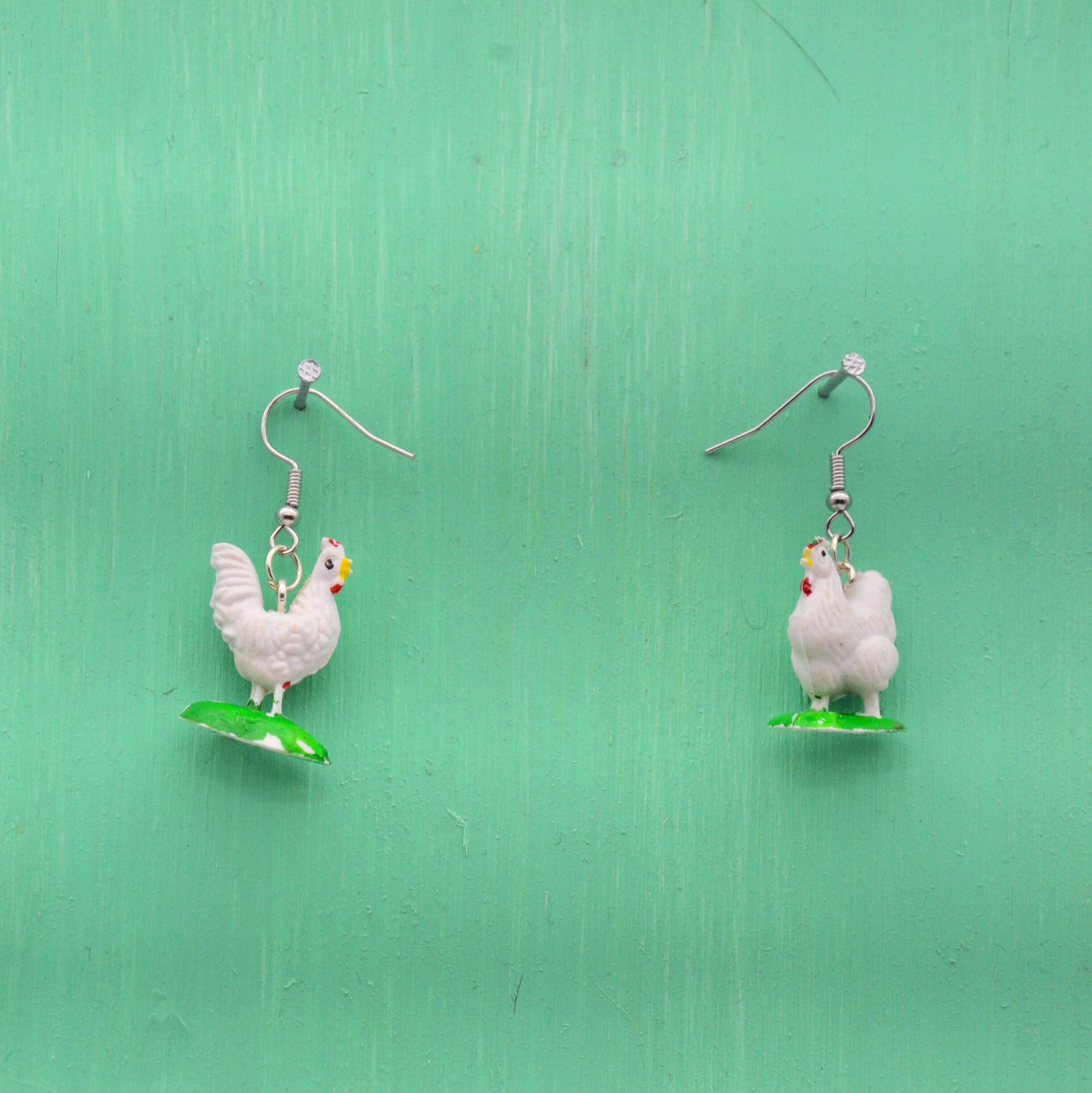 Dessa örhängen är ett par hönor, omsorgsfullt återvunna från klassiska leksaker och nu ett par kreativt och hållbara örhängen. Hängena är tillverkade av rostfritt stål, vilket ger en bra hållbarhet och är nickelfria.