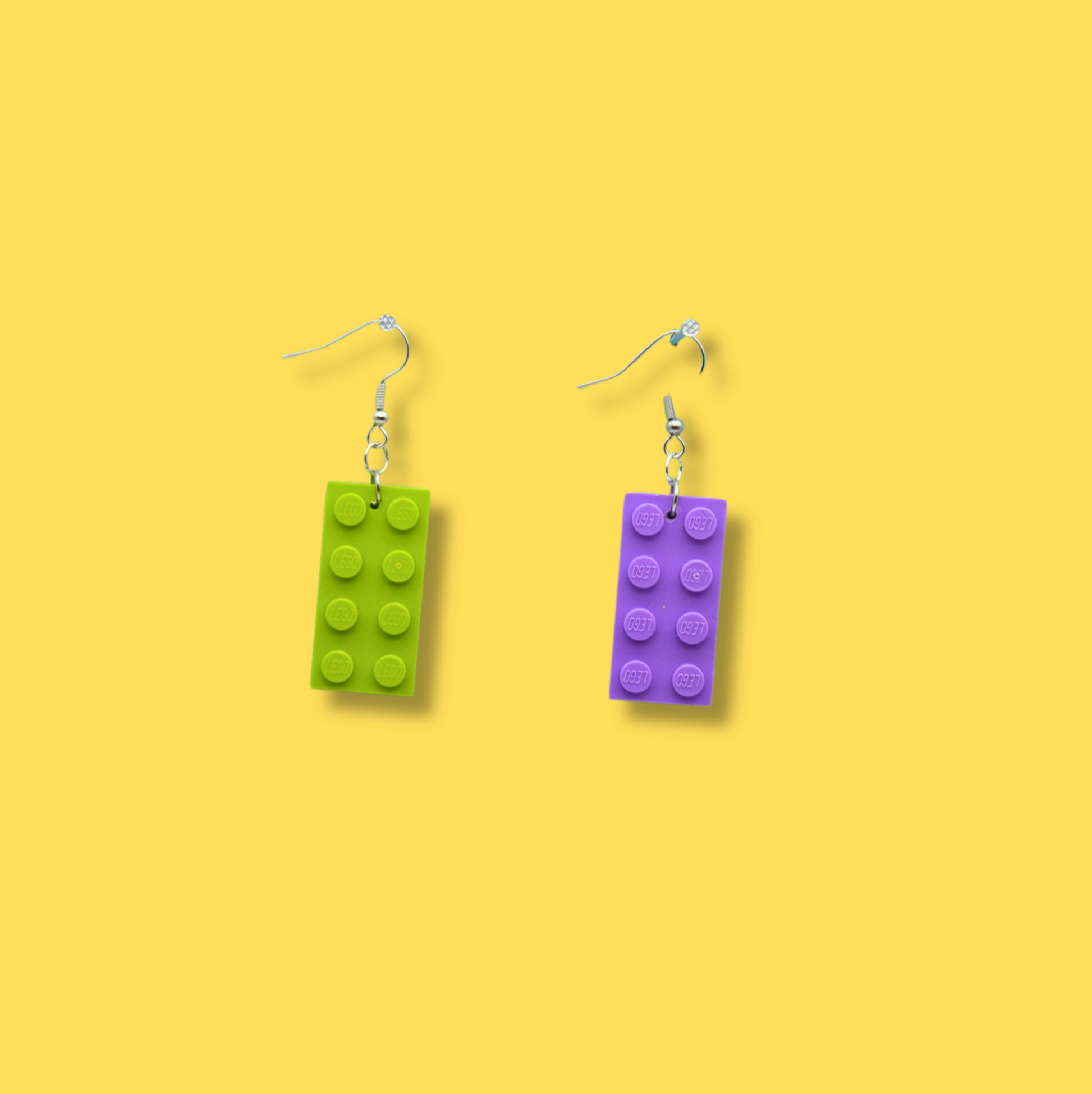 Dessa örhängen är ett par klossar, omsorgsfullt återvunna från klassiska leksaker och nu ett par kreativt och hållbara örhängen. Hängena är tillverkade av rostfritt stål, vilket ger en bra hållbarhet och är nickelfria.