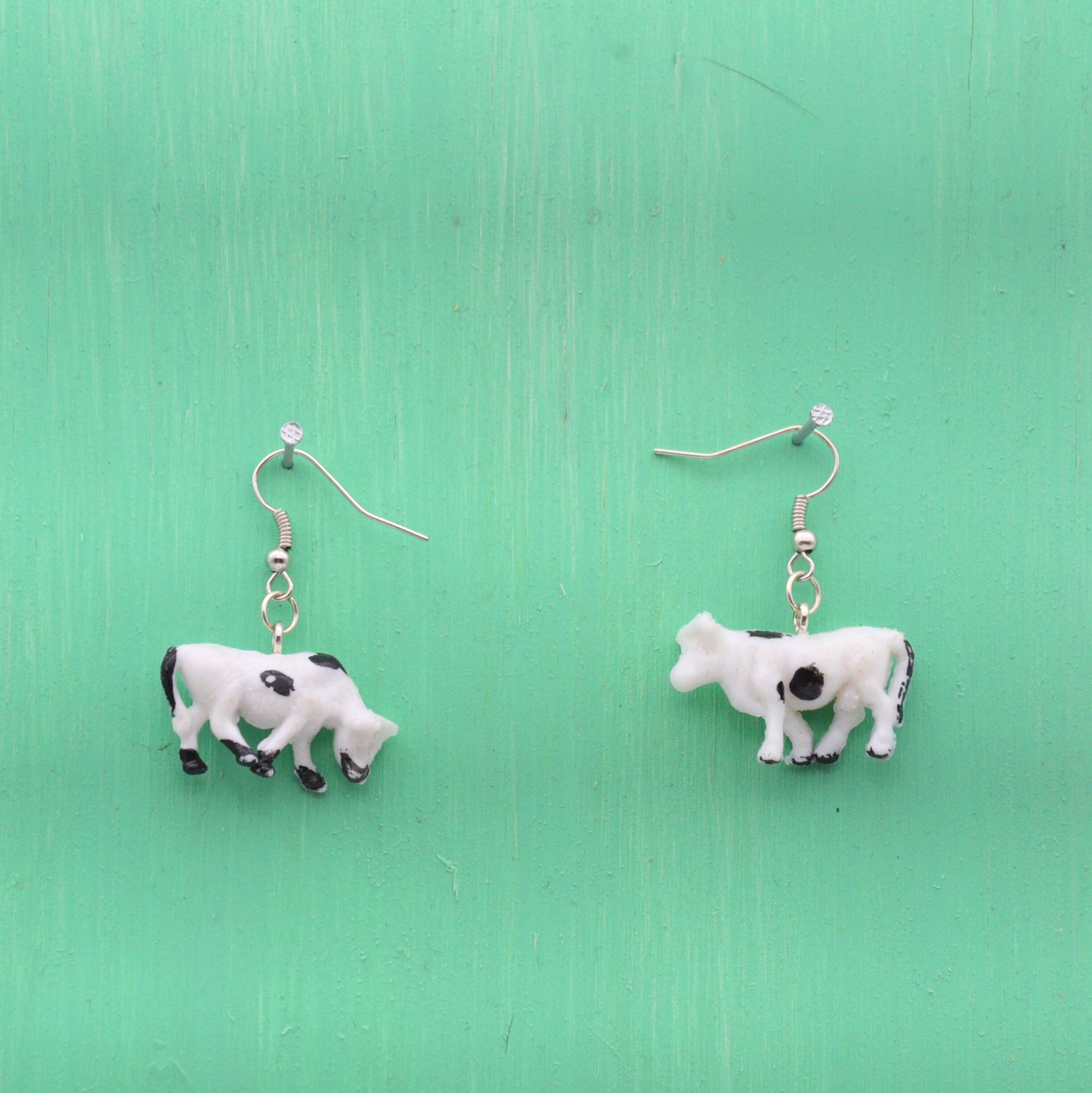 Dessa örhängen är ett par små kor, omsorgsfullt återvunna från klassiska leksaker och nu ett par kreativt och hållbara örhängen. Hängena är tillverkade av rostfritt stål, vilket ger en bra hållbarhet och är nickelfria.