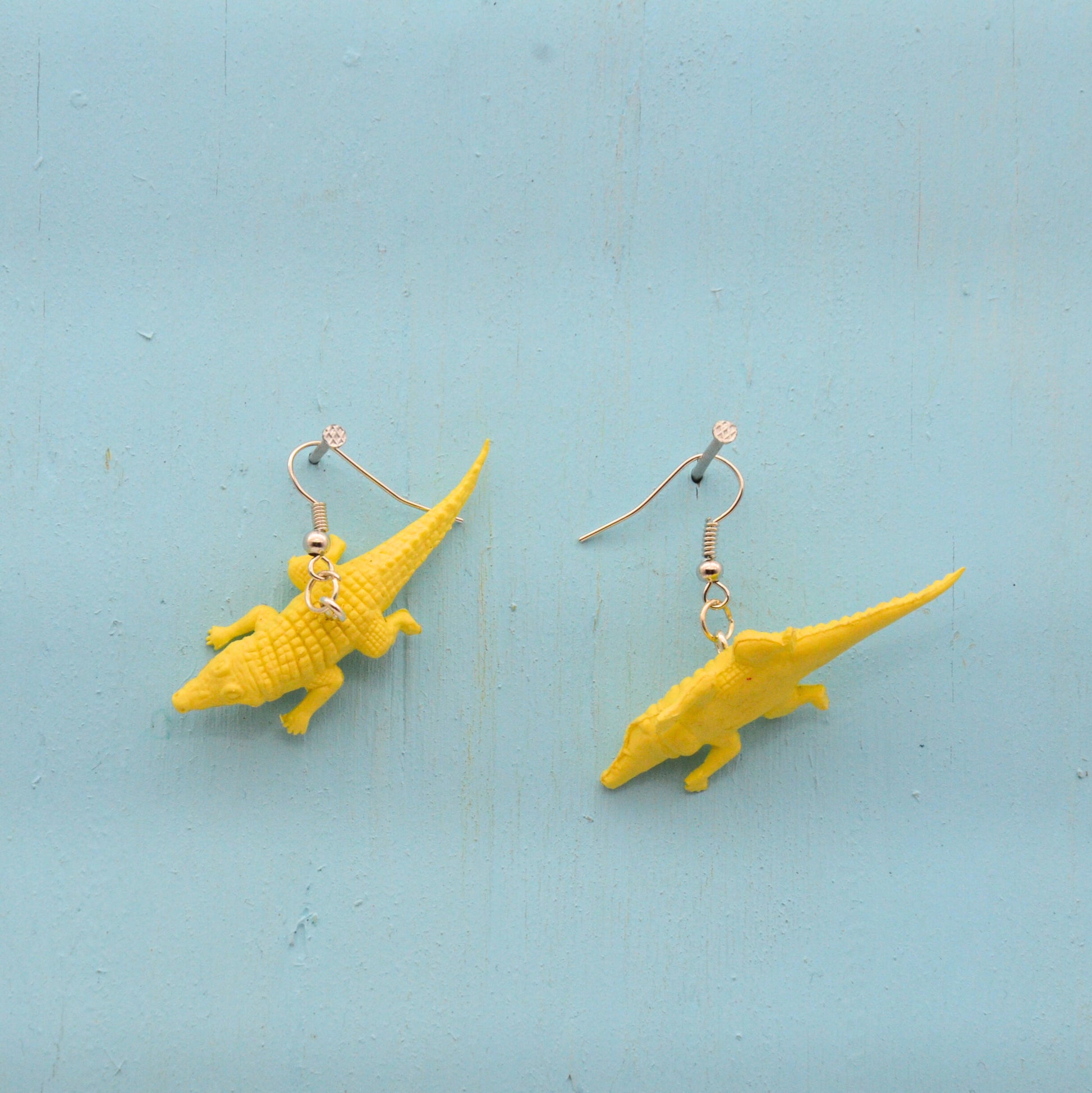Dessa örhängen är ett par krokodiler, omsorgsfullt återvunna från klassiska leksaker och nu ett par kreativt och hållbara örhängen. Hängena är tillverkade av rostfritt stål, vilket ger en bra hållbarhet och är nickelfria.