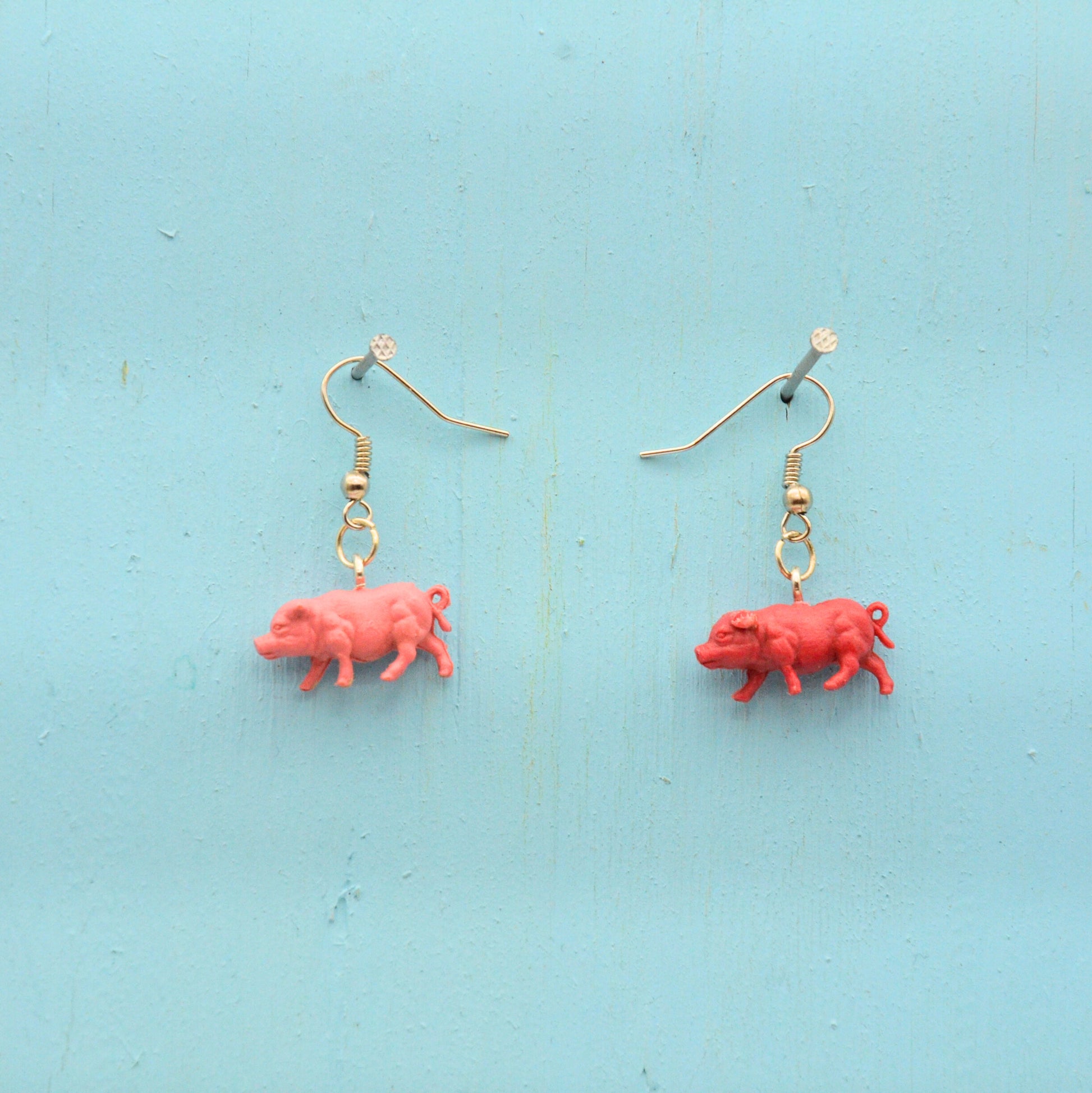 Dessa örhängen är ett par minigrisar, omsorgsfullt återvunna från klassiska leksaker och nu ett par kreativt och hållbara örhängen. Hängena är tillverkade av rostfritt stål, vilket ger en bra hållbarhet och är nickelfria.