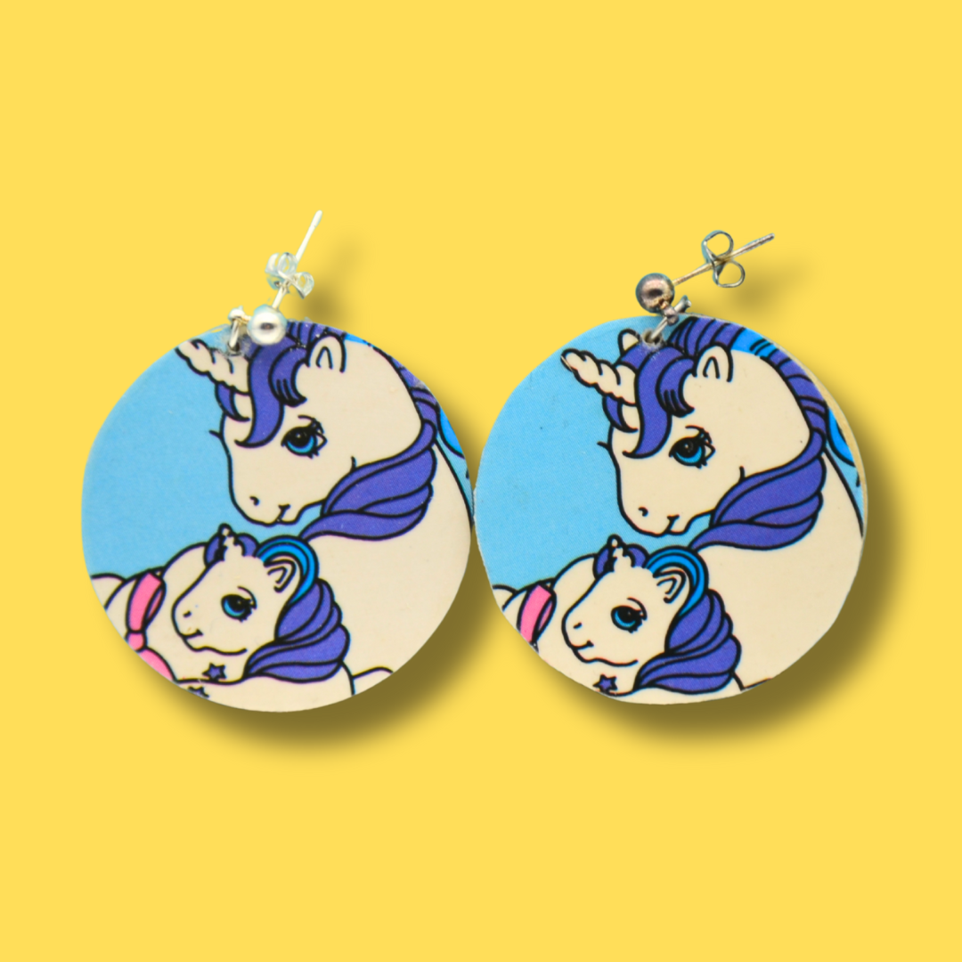 Dessa örhängen är ett par vita och lila ponnys, omsorgsfullt återvunna från klassiskt spel och nu ett par kreativt och hållbara örhängen. Hängena är tillverkade av rostfritt stål, vilket ger en bra hållbarhet och är nickelfria.