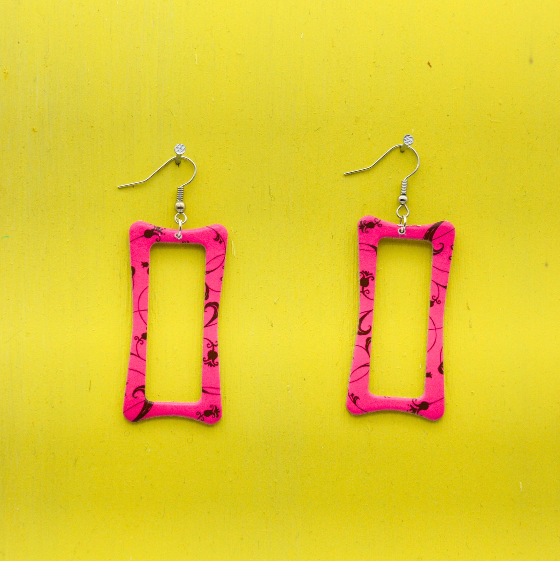 Dessa örhängen är ett par rosa ramar, omsorgsfullt återvunna från klassiska saker och nu ett par kreativt och hållbara örhängen. Hängena är tillverkade av rostfritt stål, vilket ger en bra hållbarhet och är nickelfria.